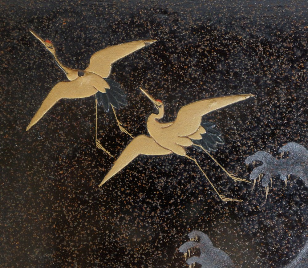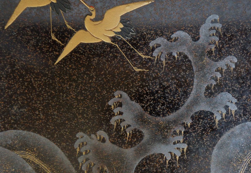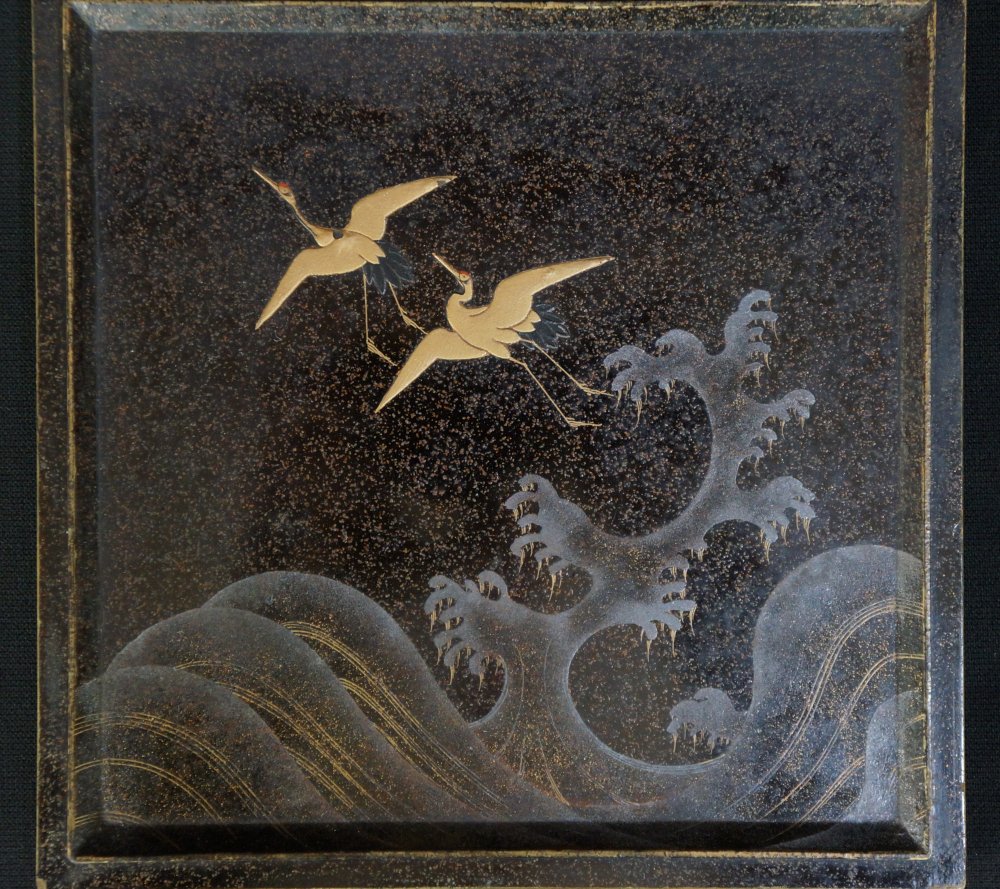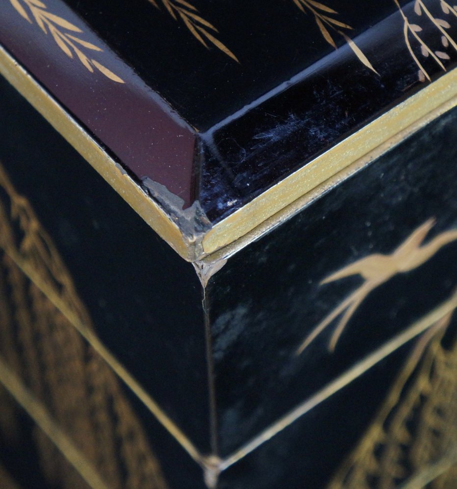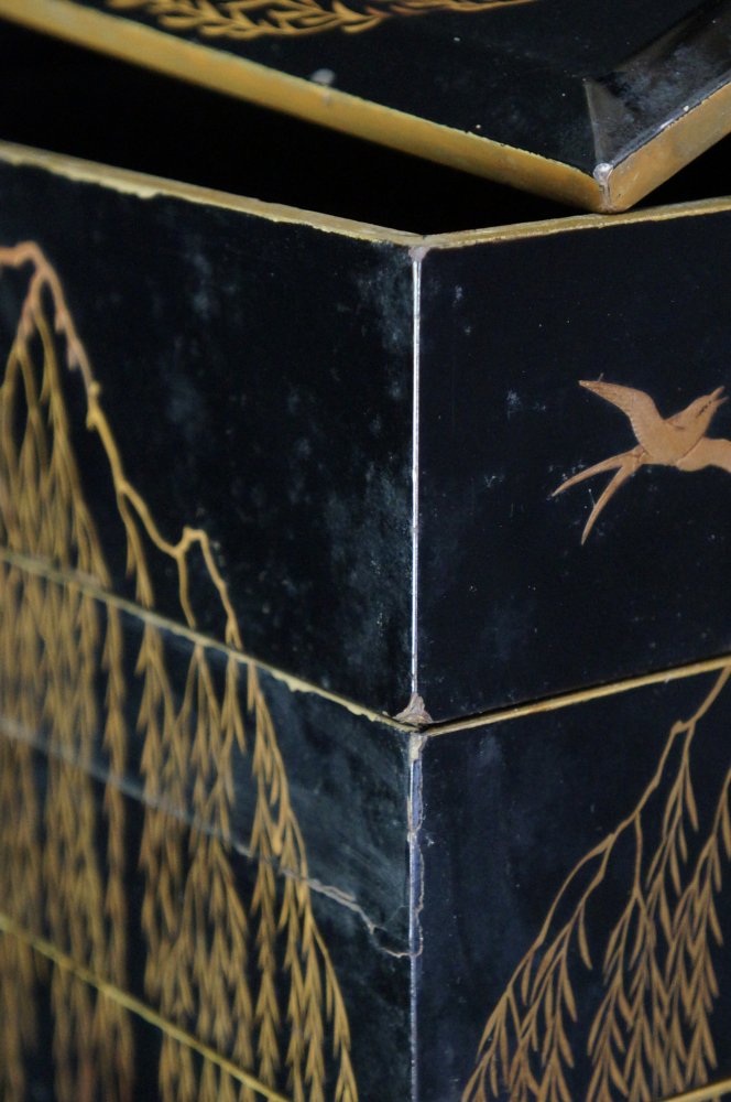 Japanese lacquered wood box Jyubako Bento with fine Maki-e lacquer Yanagi willo tree with swallow birds, inner lid decorated with crushing waves and Tsuru crane birds. Total of 4 food sections and lid. Wear from long usage and time, old restorations, wood expansion. Extensive wear on protective wood box. Wajima Japan craft.