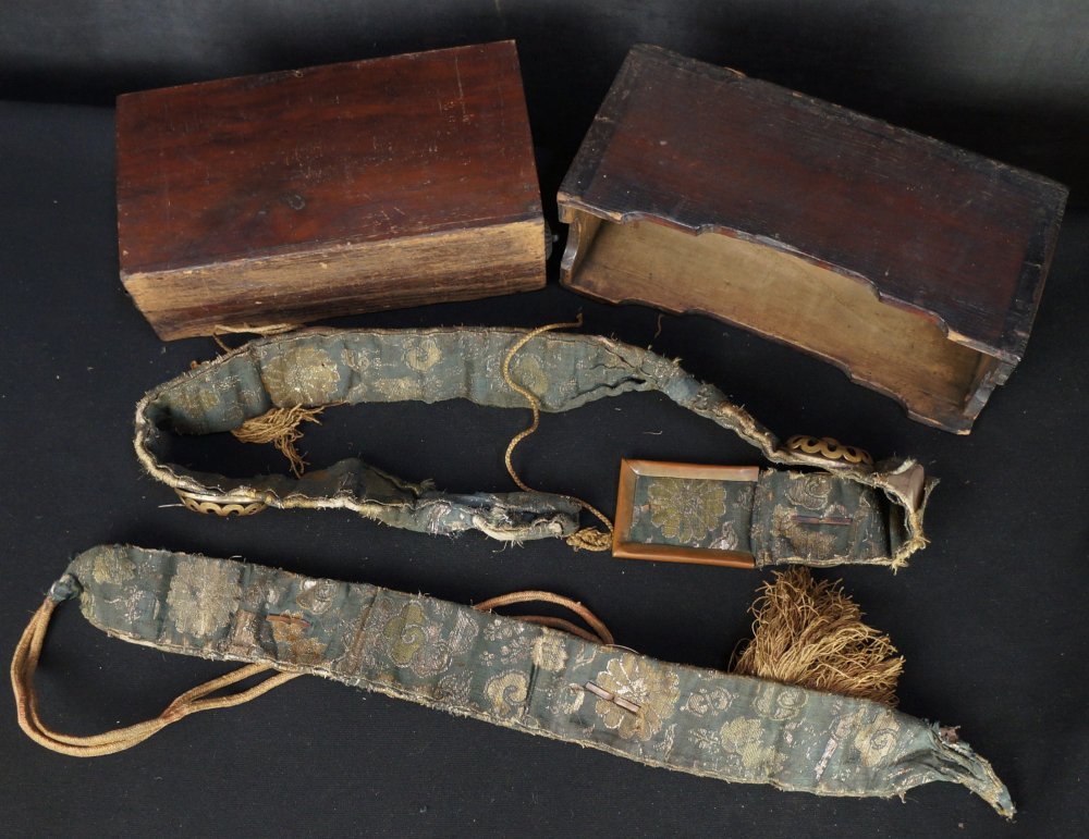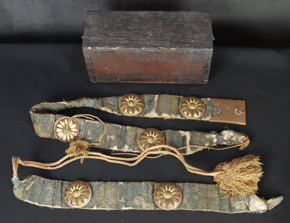 Antique Japanese Buddhist temple Zen Monk garment, found preserved inside relics box made from lacquered wood and bronze fittings, the content silk straps are made of 2 section decorated with Buddhist weels (Dharmachakra) and tassels. Temple hand craft manufacture, no temple or name found to be associaded with this find. Delicate conditions, to be handled with care.