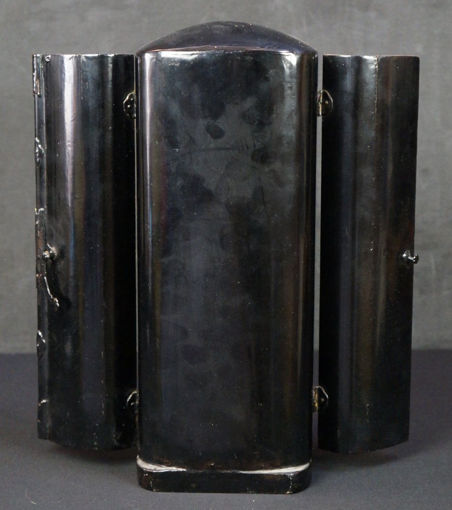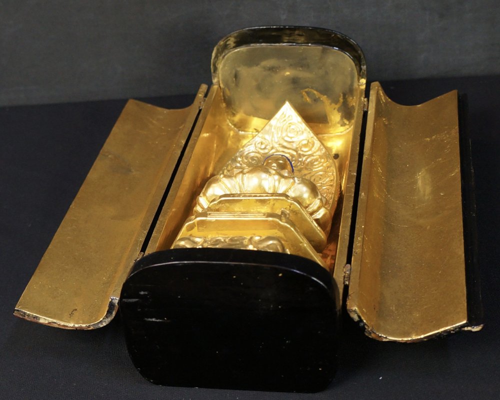 Japanese Buddhist shrine temple sculpture, wood Zushi case with Urushi black lacquer and gold leaf technique. Zushi in very good conditions, it seems it has been restored with black lacquer several times, over all good conditions. Immediately usable as in photos.