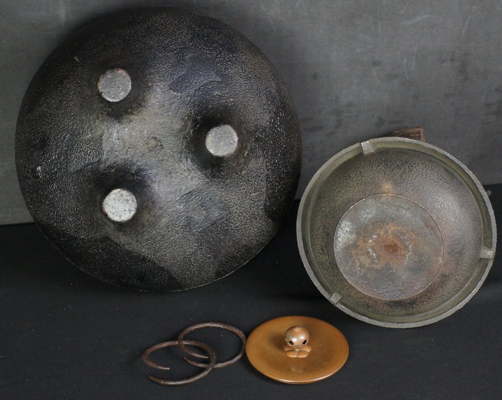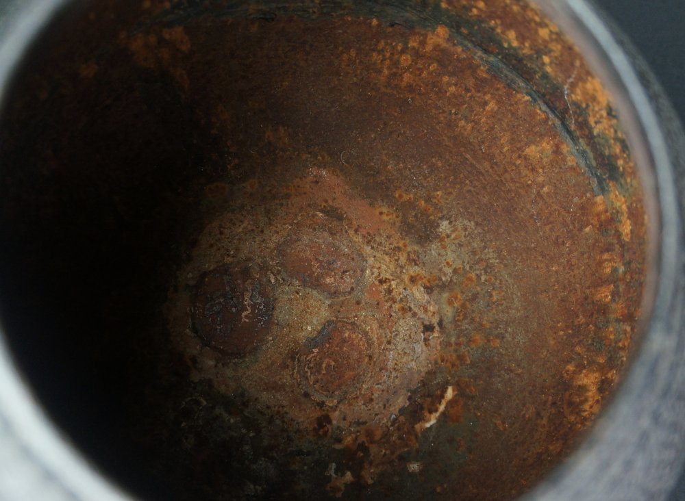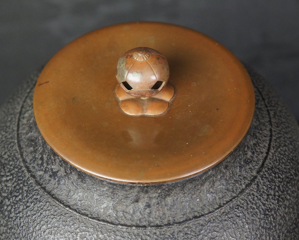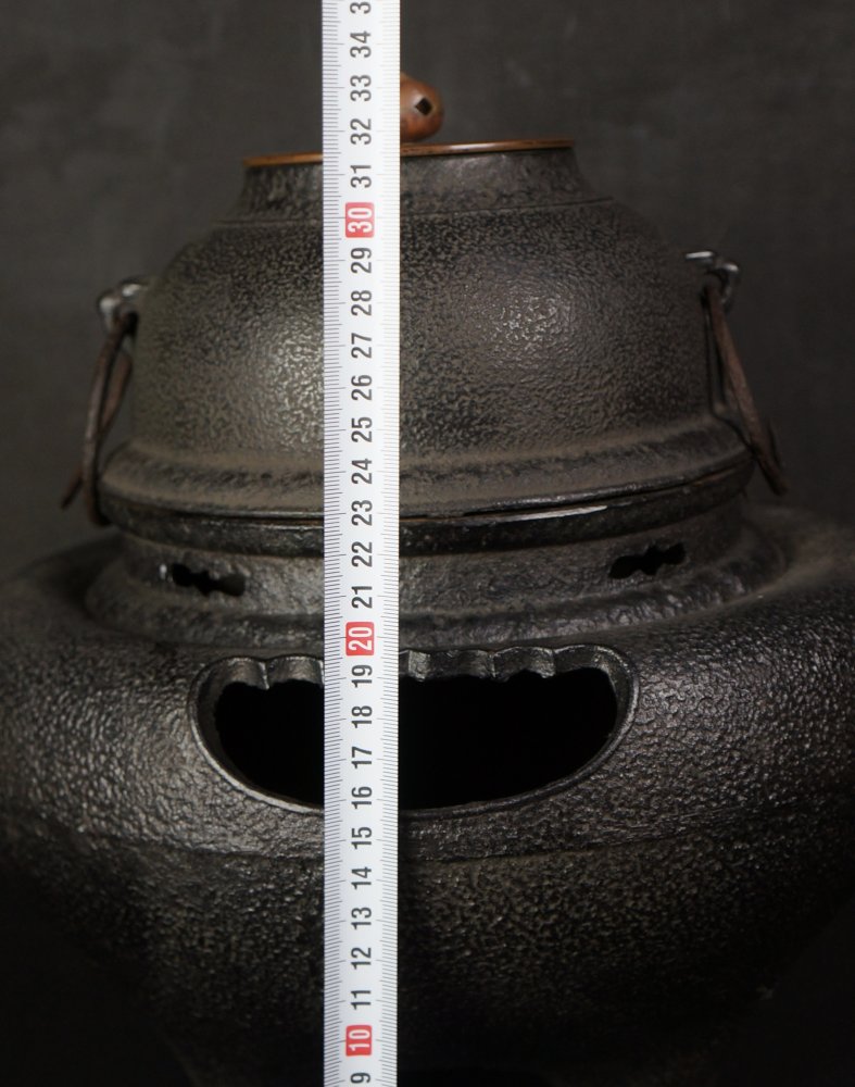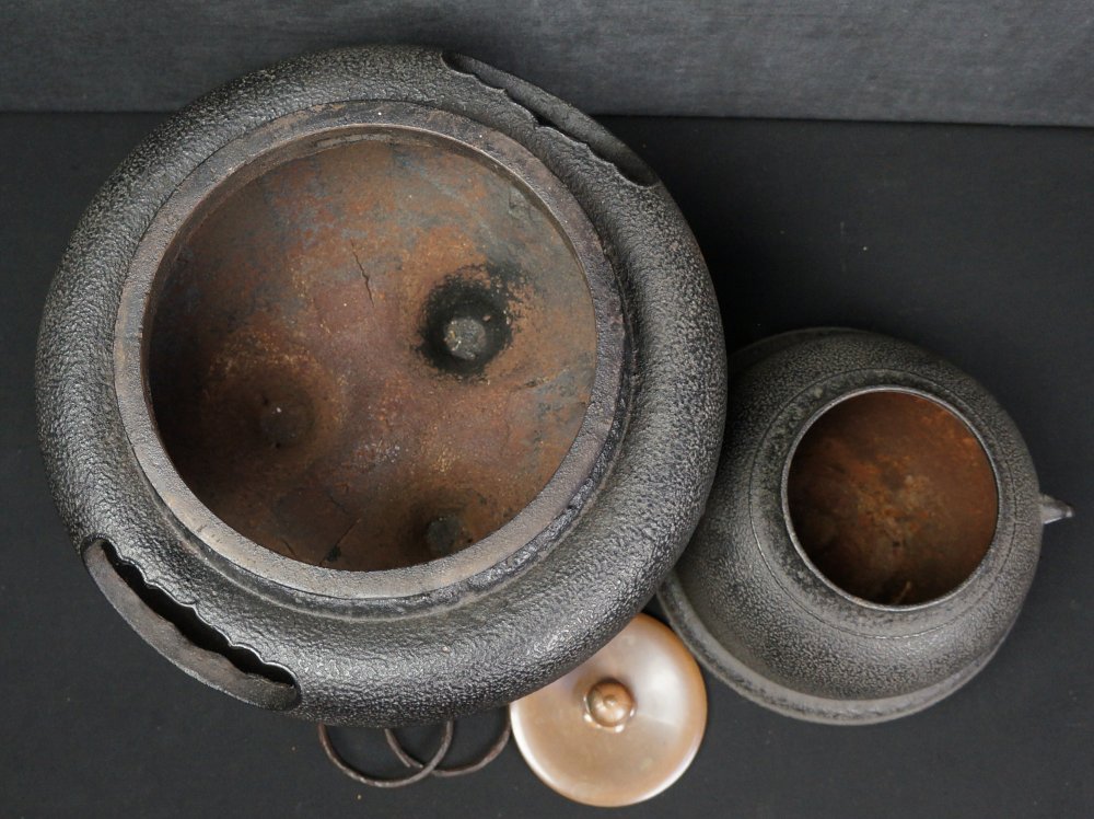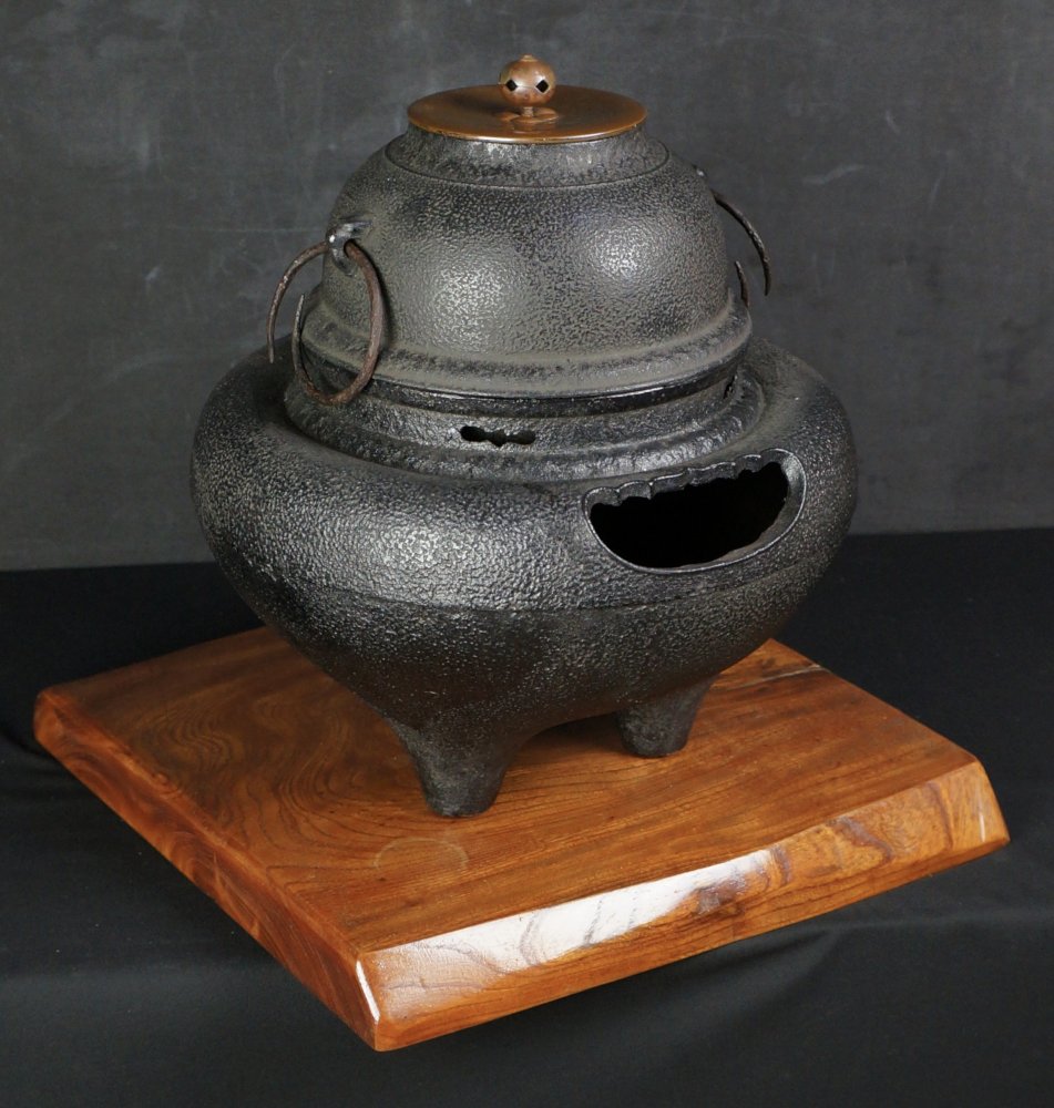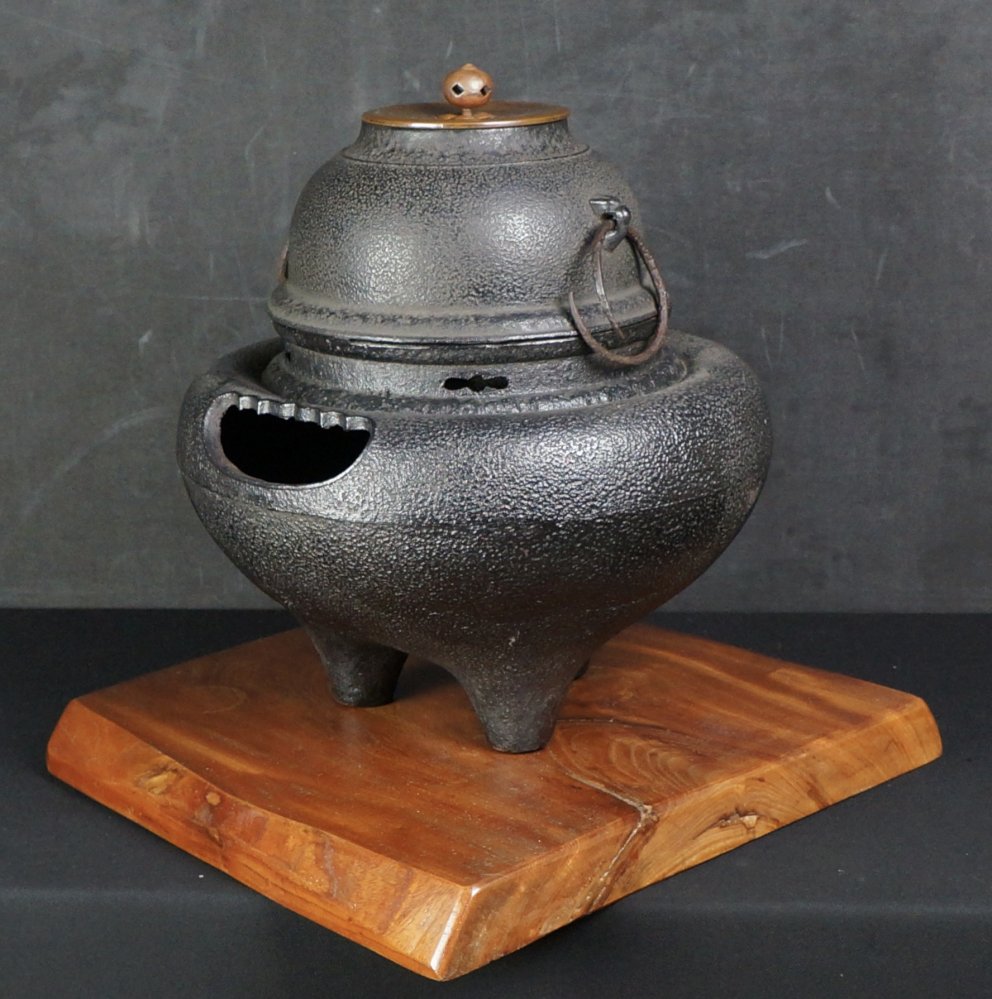 Japanese Tea Ceremony kettle water heater Nanbu Chagama cast iron. Immediately usable no damages, some wear from usage and time, inner oxidation, no leaks,  complete of wood base. Traditional Japanese Chagama craft.