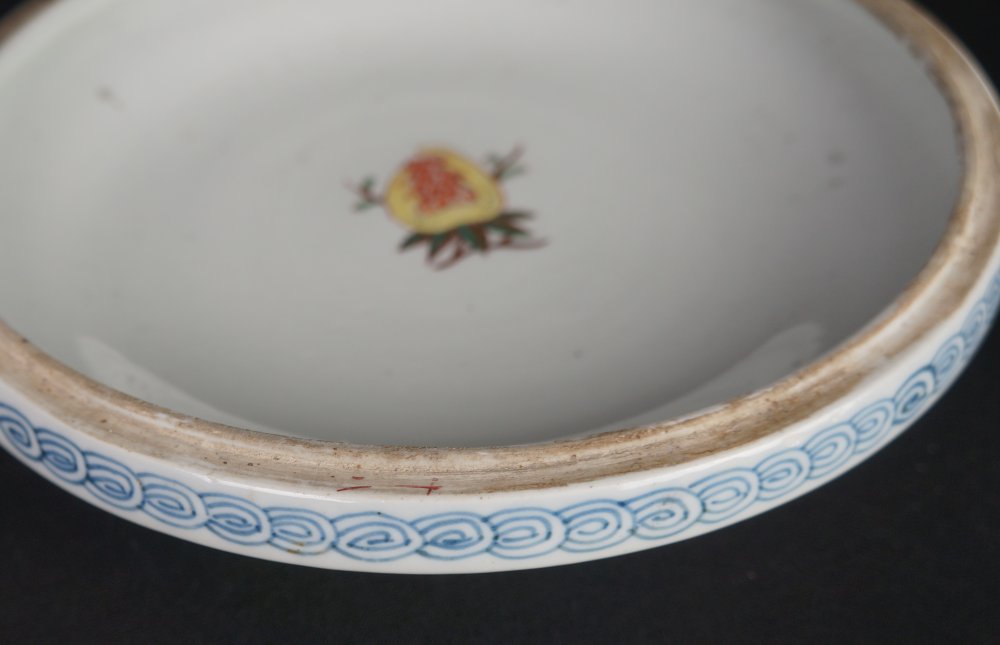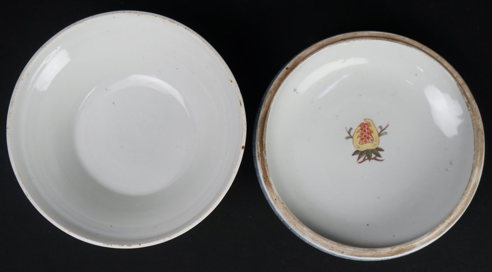 This bowl is in very good antique condition, showing only light signs of age and use. There are no chips, cracks, or repairs, original wood box with no lid—a rare find for a piece of this age.