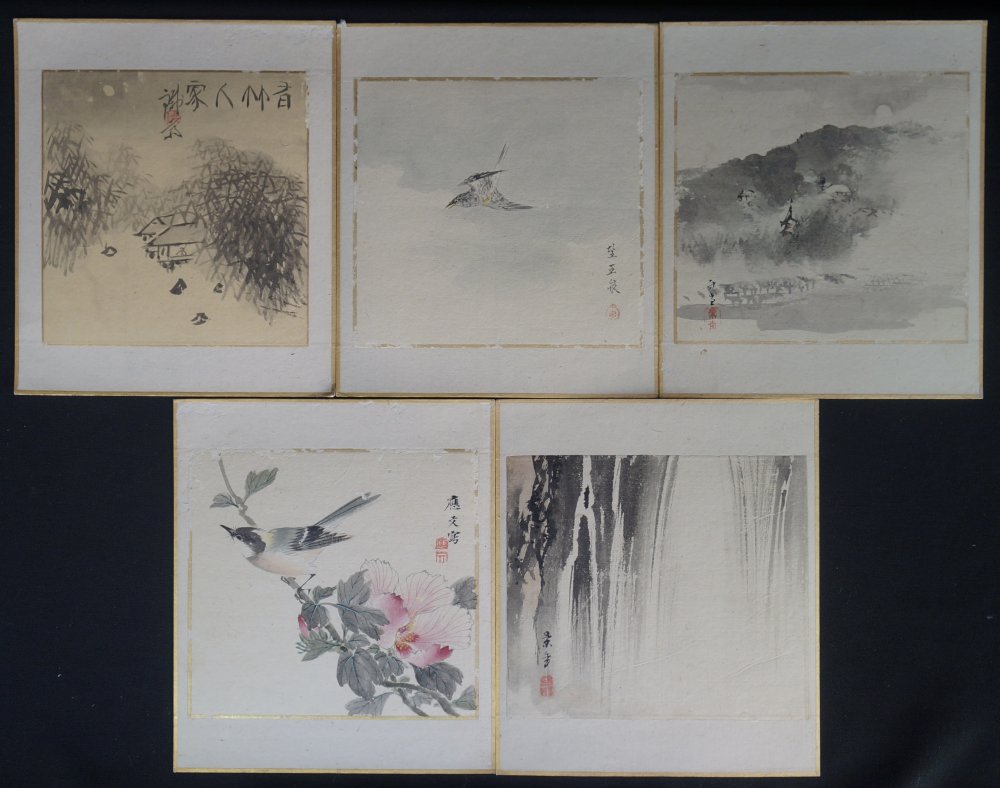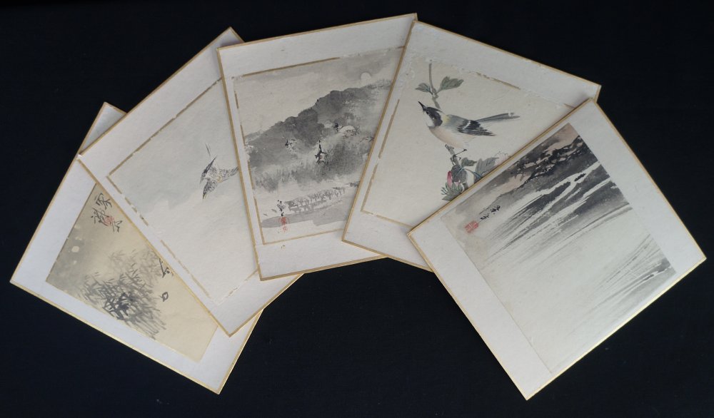 Antique Japanese watercolor      compositions on paper, total of 5 Sumi-e and watercolor technique.  Signed and sealed by artists. Medium good conditions, wear from time and usage on surface. Immediately usable in its original conditions.