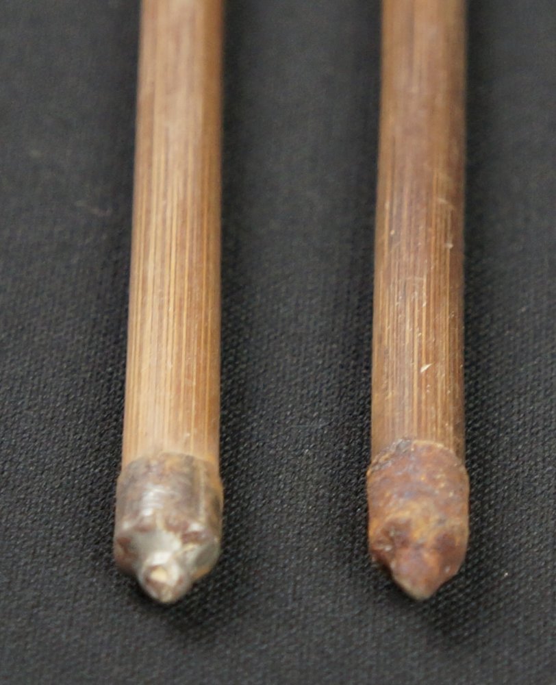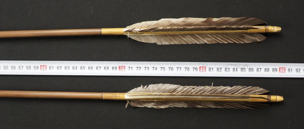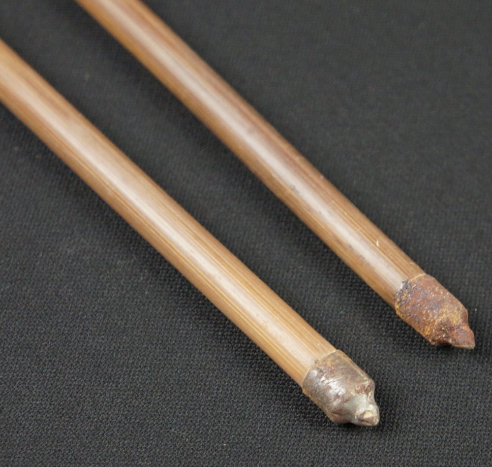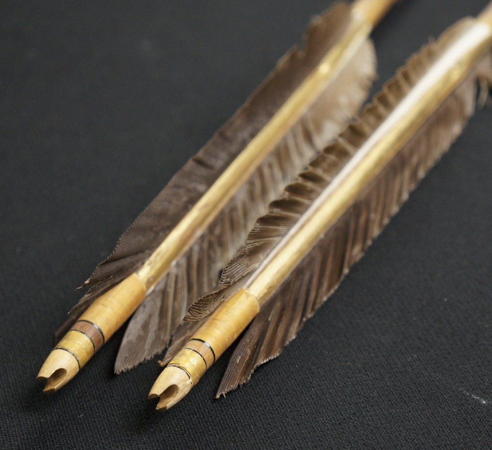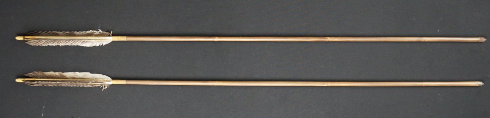 Japanese Ya arrow set of 2, hand made from bamboo shaft, feathers and iron tips. Good conditions, some wear from time and usage, to be used ans antique/vintage item, fine Japanese craft.