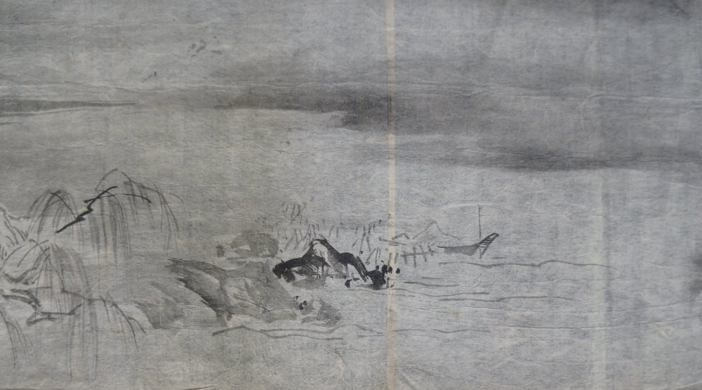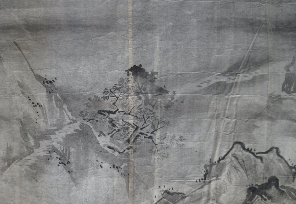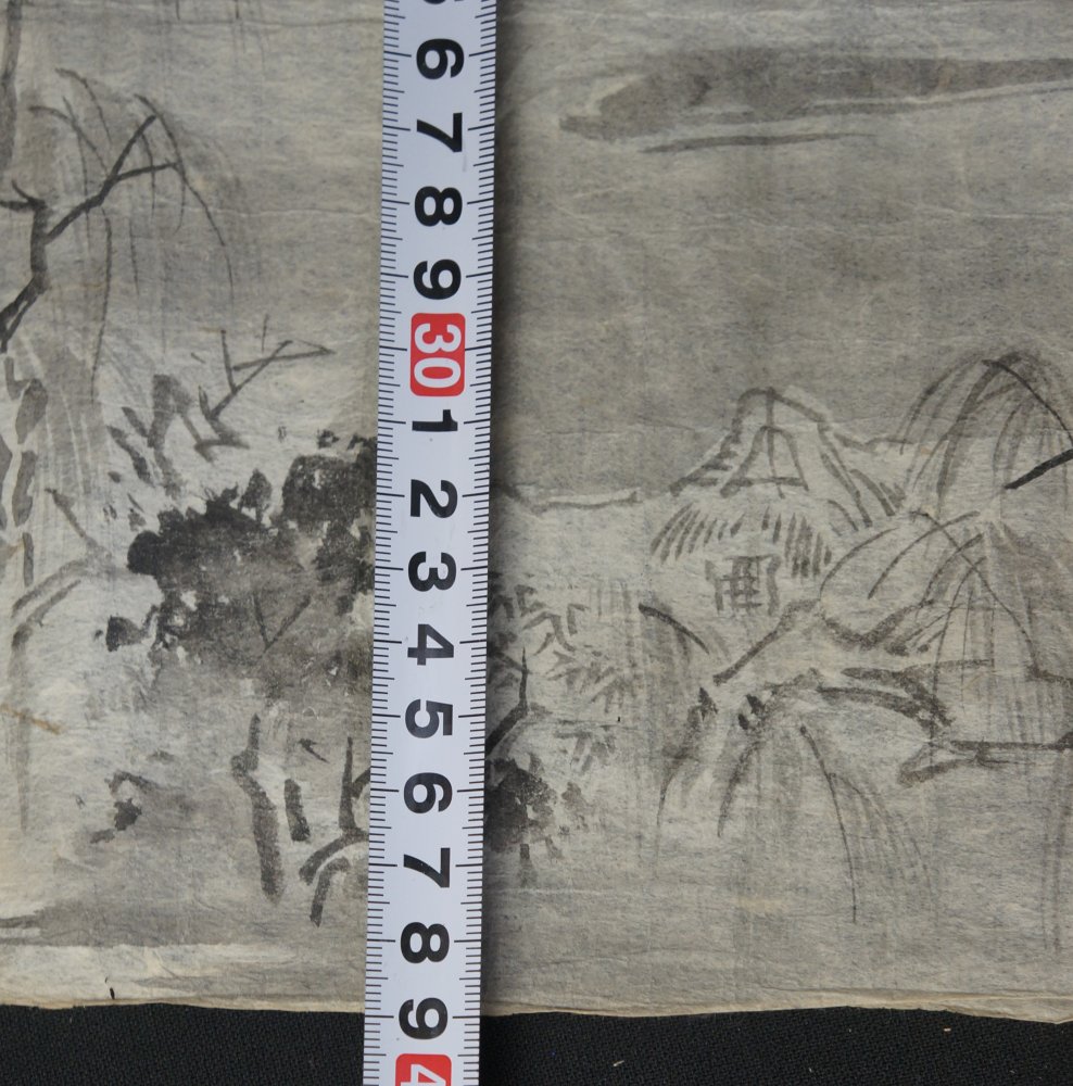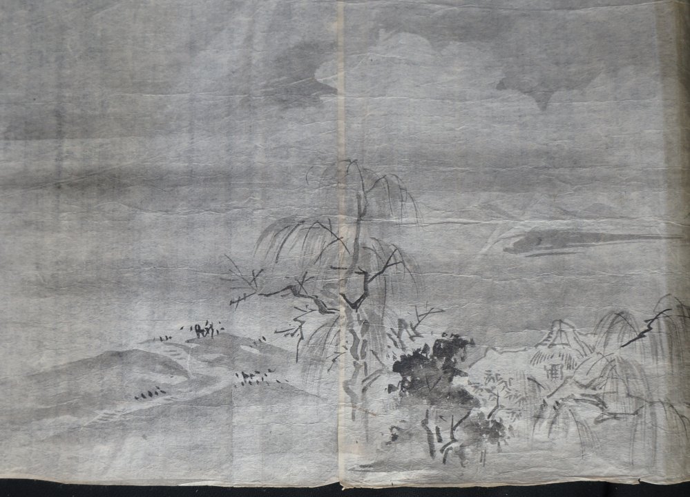 Antique Japan sketch on paper rural landscape Sumi-e and Fude brush ink paintings on Washi paper. Good conditions, some wear from usage and time, natural creases from antique folding. Item is in original conditions as it has found.