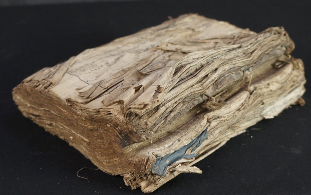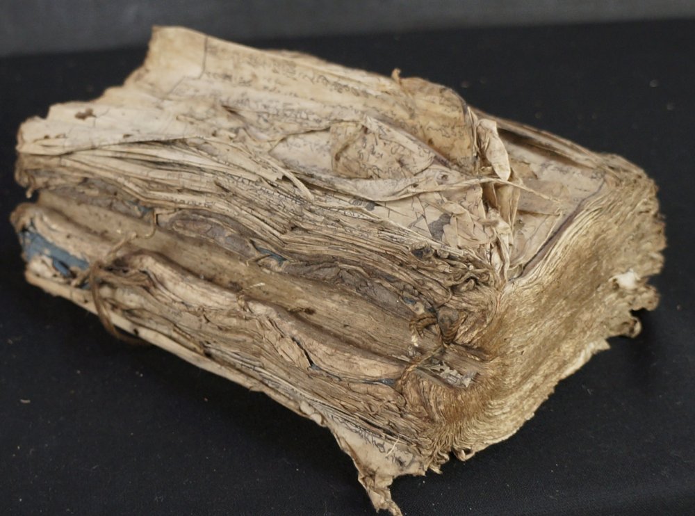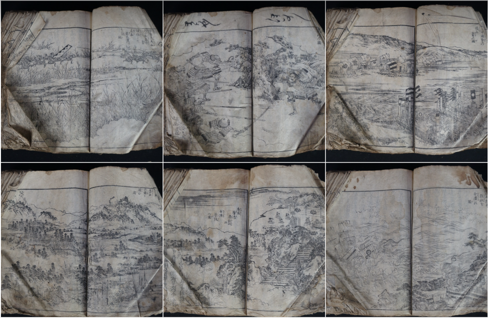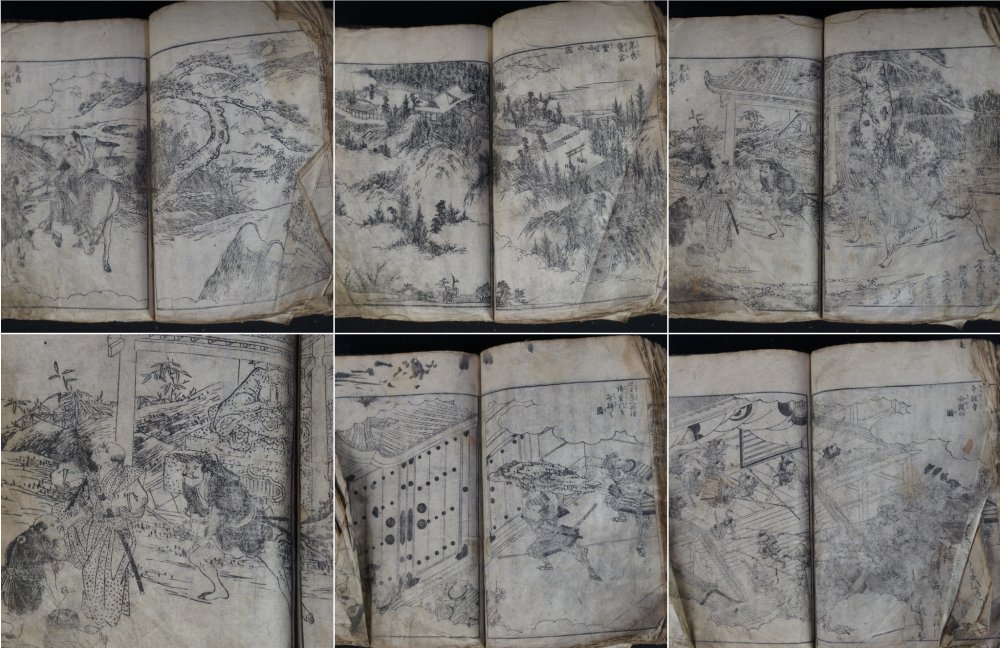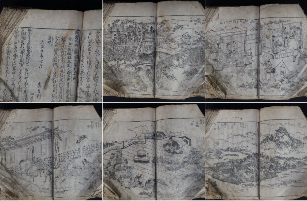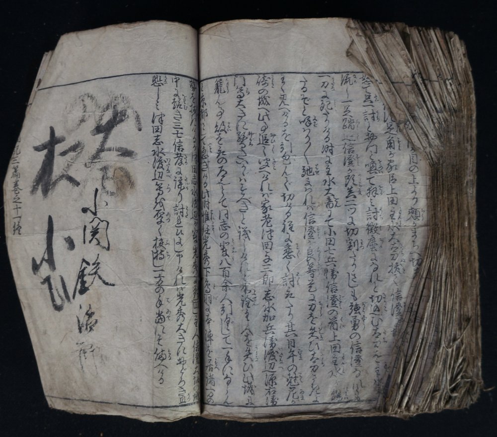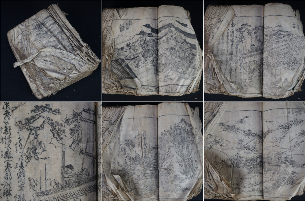 Antique Japanese book of Samurai wars, made of several volumes bound together, in very poor conditions, mid Edo period, alternation of illustrated and written pages depicting war, killings, riots, seizures and gruesome famings. Fron and back in precarius conditions, inner pages good. Do be handled with care, in original conditions as discovered in old Kura book chest.