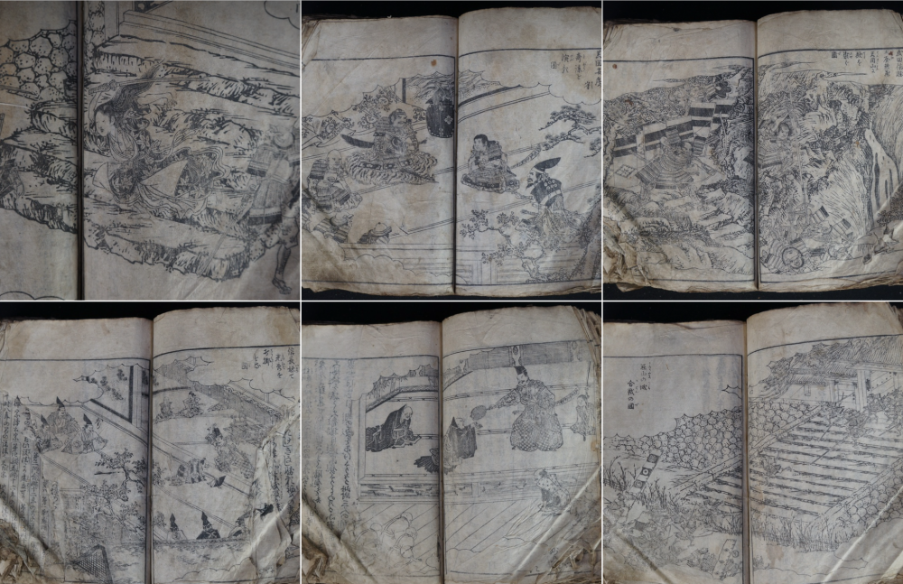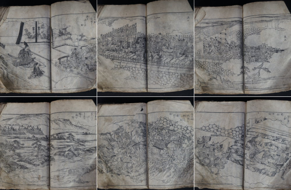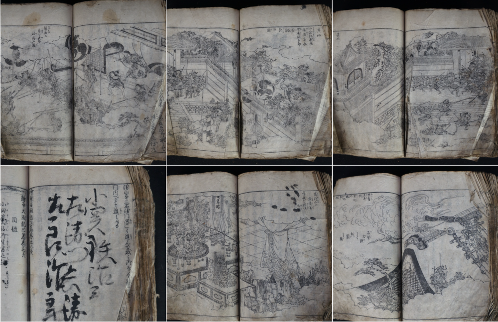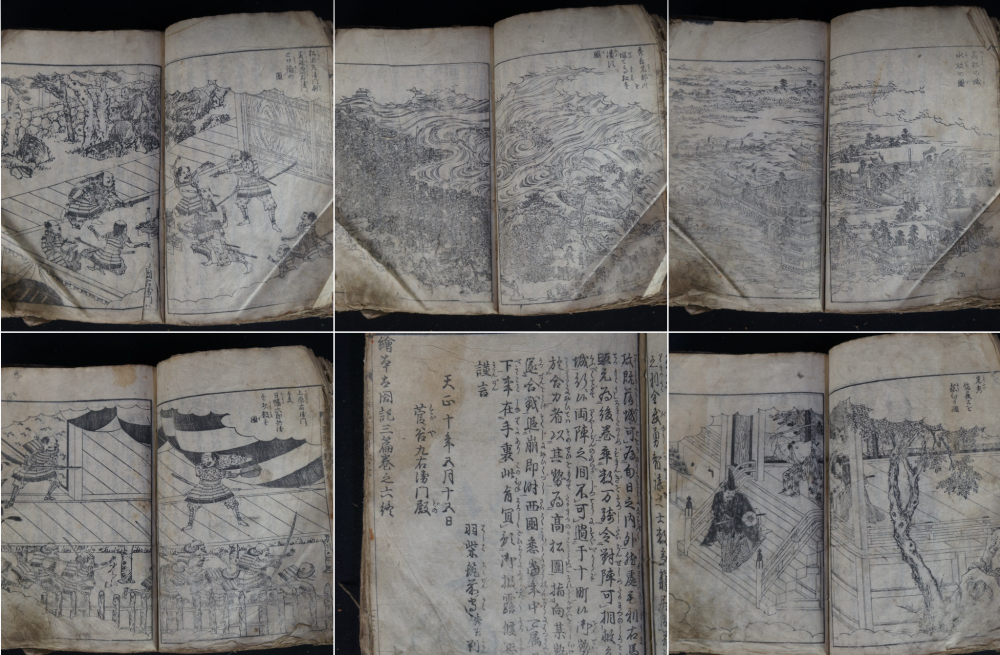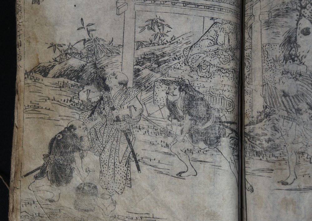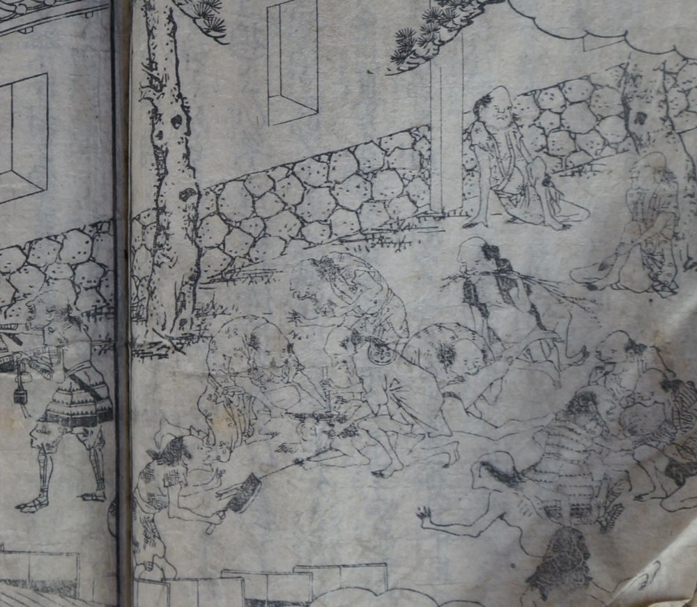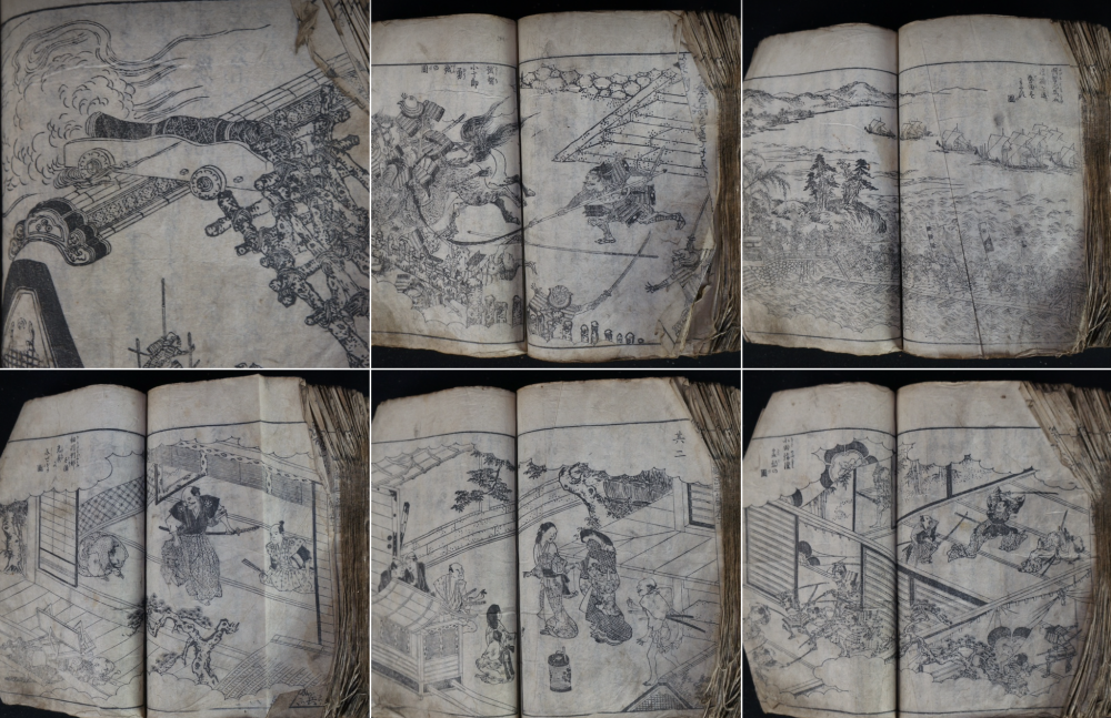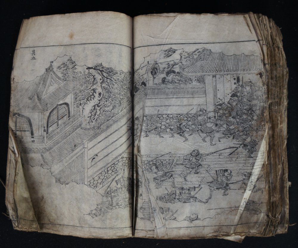 Antique Japanese Samurai wars woodblock print book 1700 graphic seens