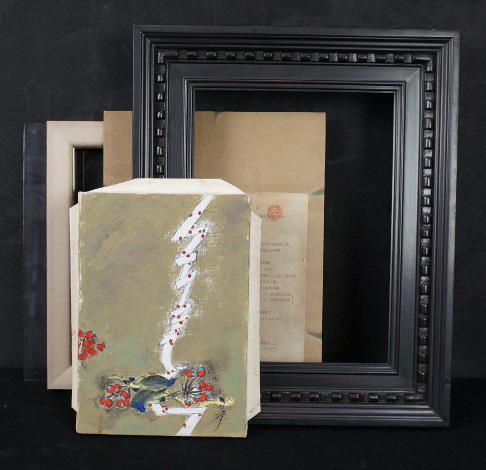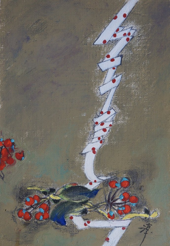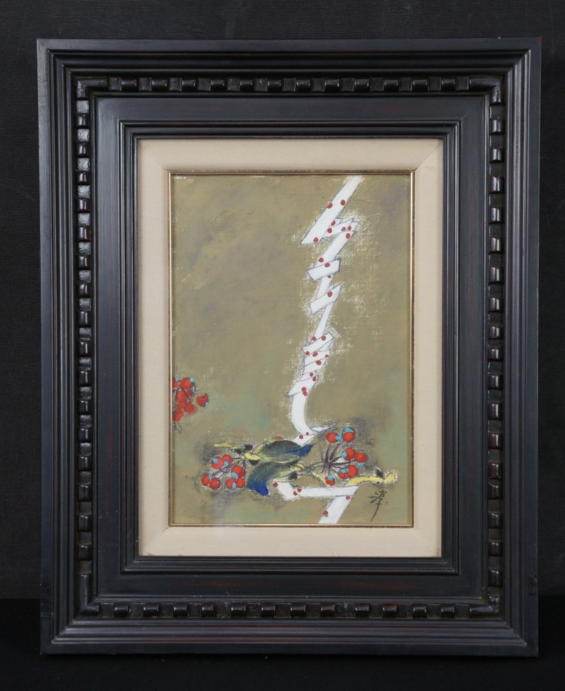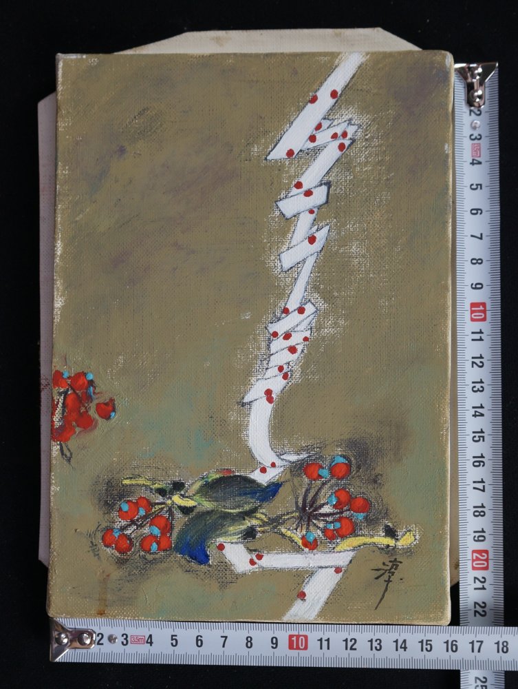 Minimalist Japanese symbolist painting winter berries with Kami paper stripe. Oil on canvas technique. Signed by artist Junko Sawada (沢田淳田), with sealed certificate on the back, oil technique, immediately usable.