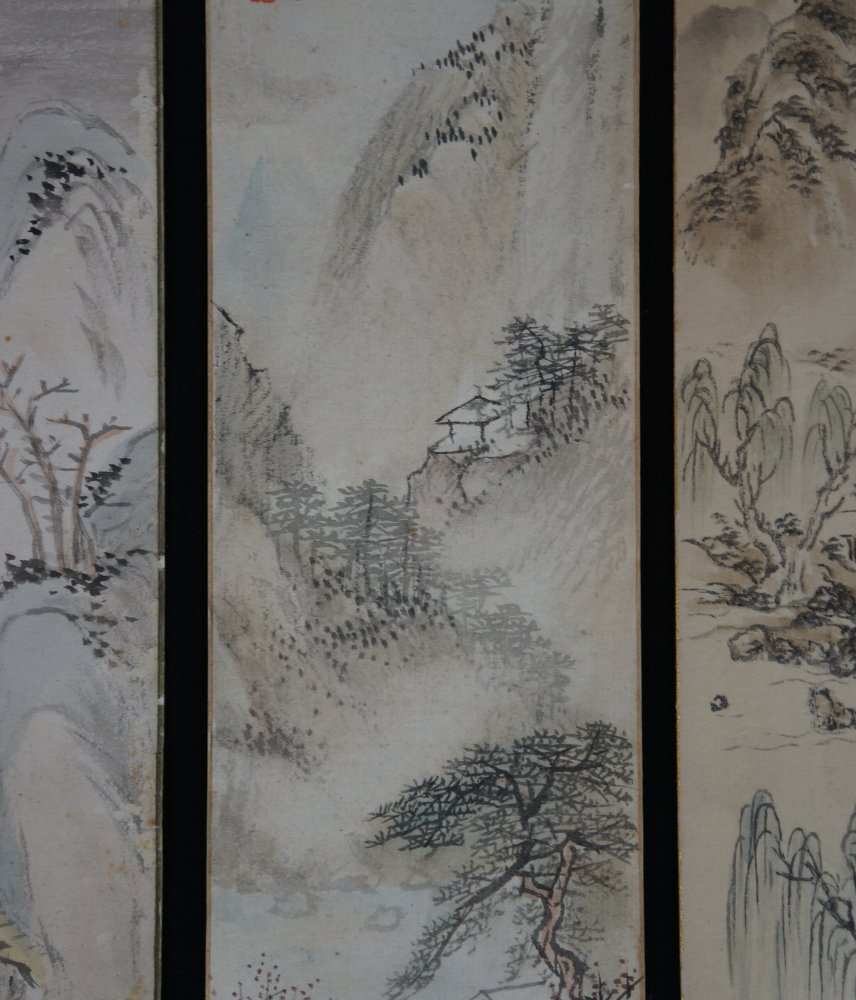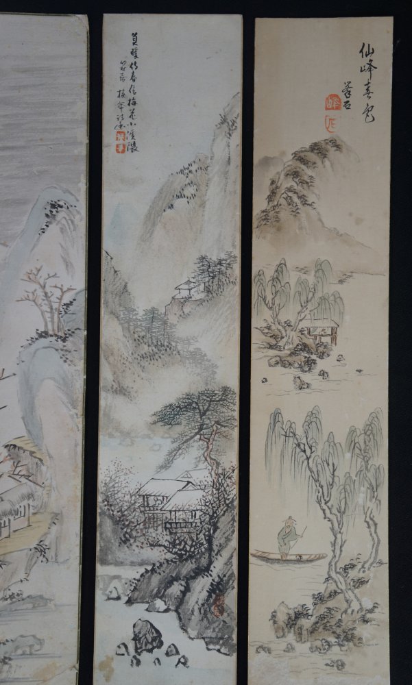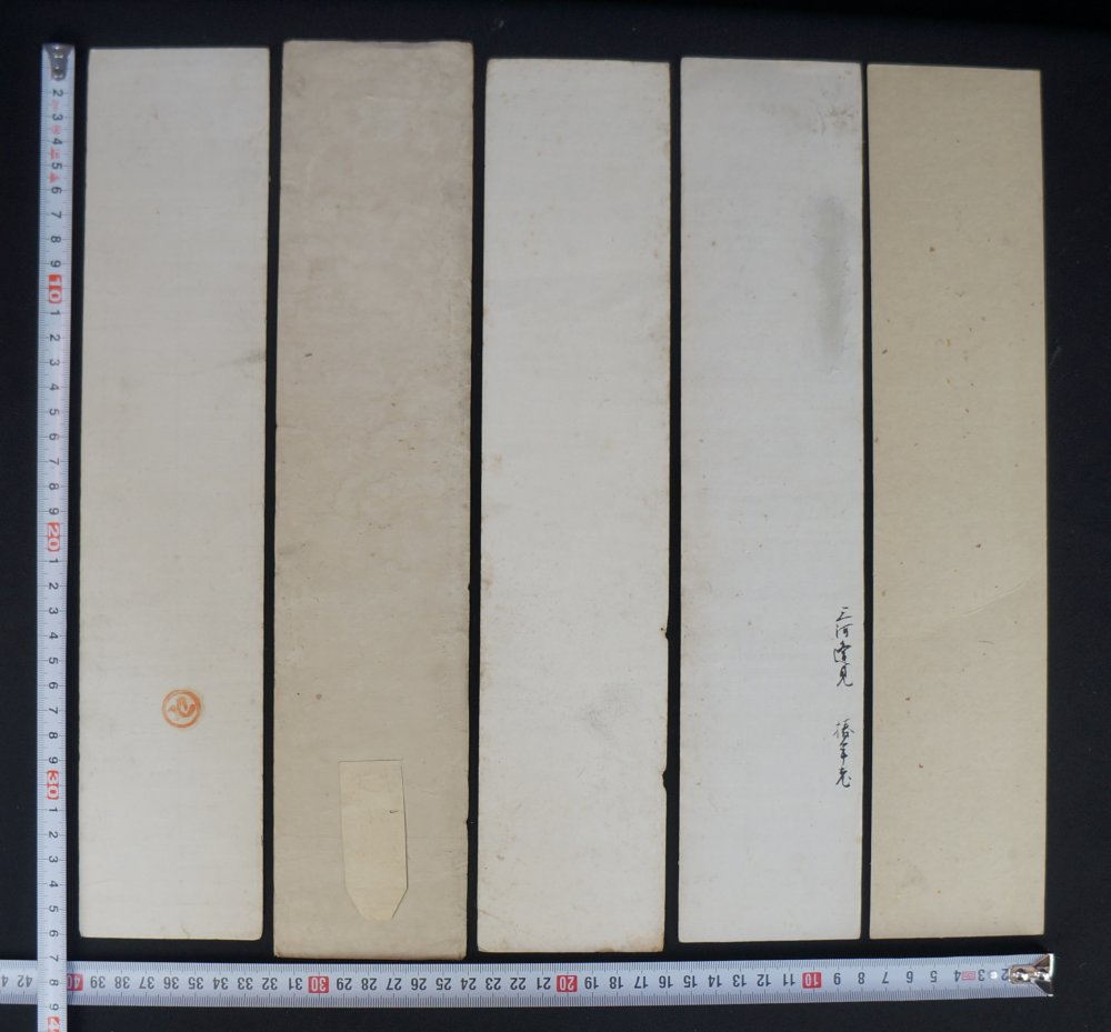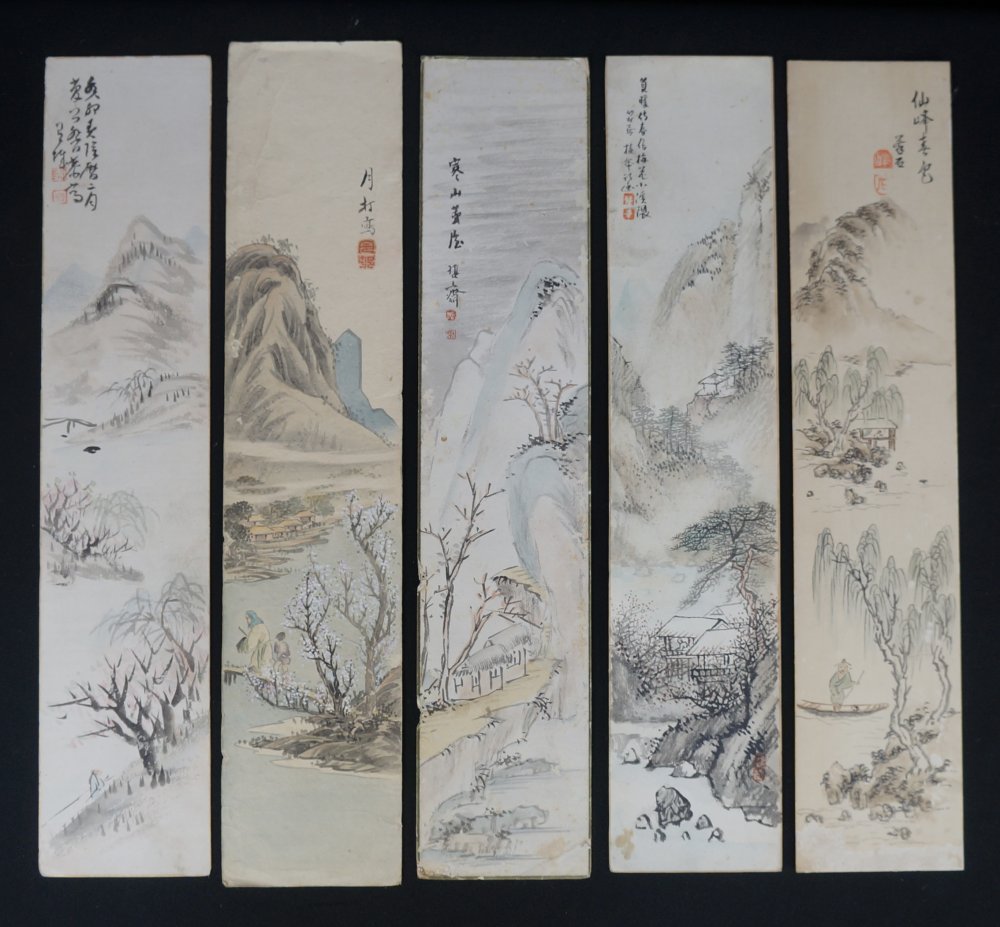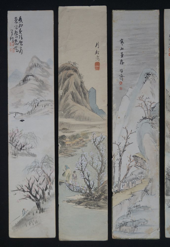 Antique Japan Zen art Tanzaku total of 5 vertical Tanzaku painting, watercolour technique. Well preserved with some wear marks from usage and time. Each with different landscape and season, different authors each sealed and signed. Antique Japan rural art.