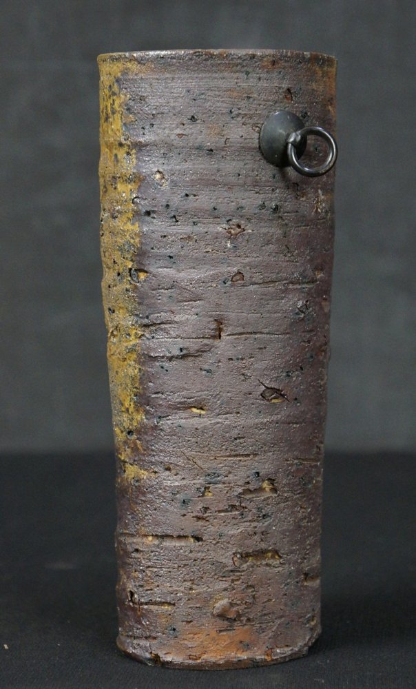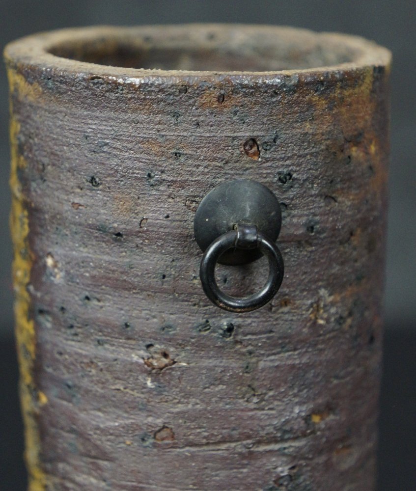 Japan Bizen ceramic Hanaire floral vase wall hanging 1970 Ikebana kiln art