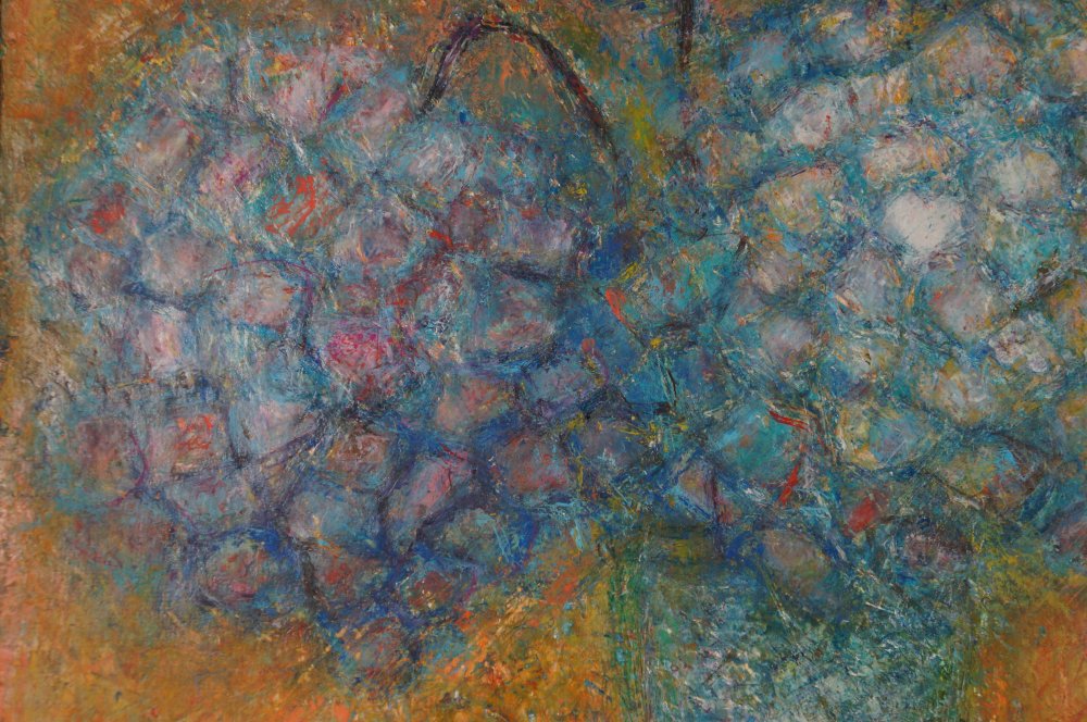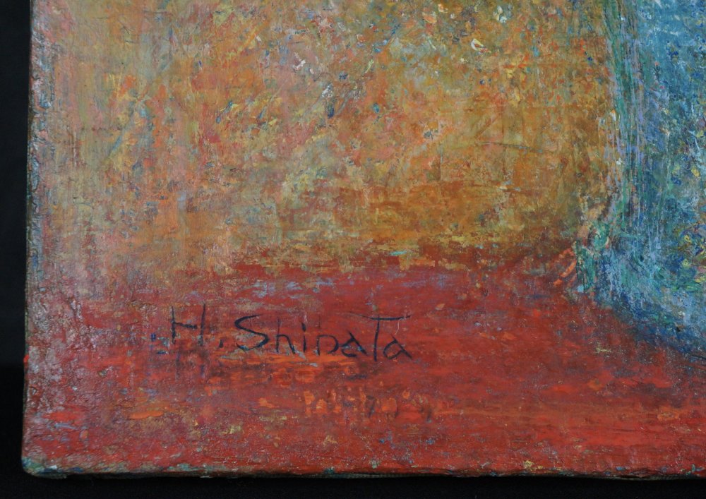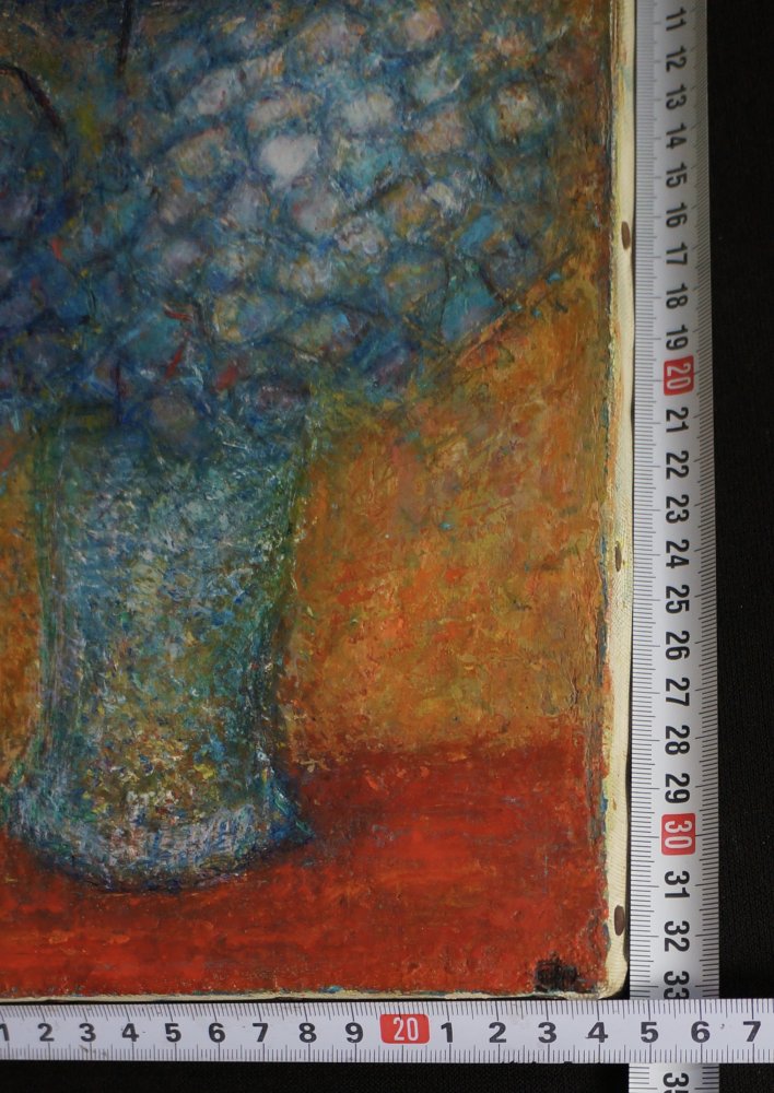Vintage Japanese floral oil painting of Ajisai hydrangea flower on canvas, oil with spatola and brush technique. Sealed by artist Shibata Haruo (柴田), oil technique, immediately usable.