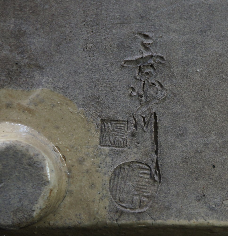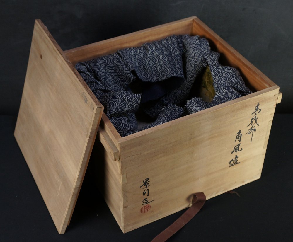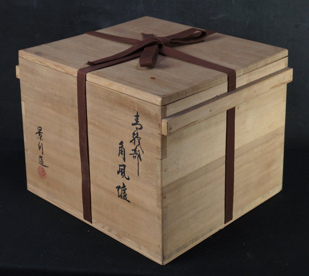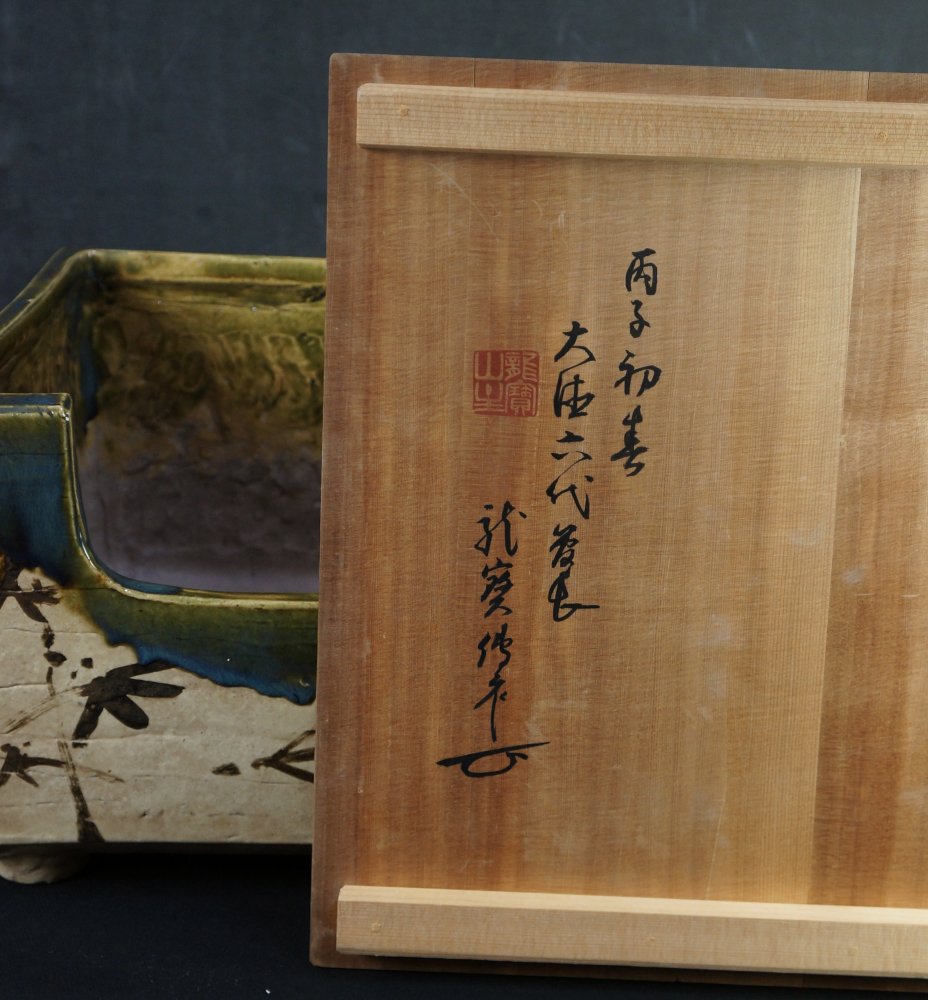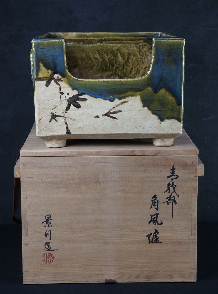 Fine Ao-Oribe Japanese ceramic Furo (風呂) brazer for tea making. Very nice shaped, surface and design, immediately usable. Signed by potter master on bottom and protective wood box Yanokeisen (矢野景川). No wear marks. Nice decorative Tea Ceremony item.