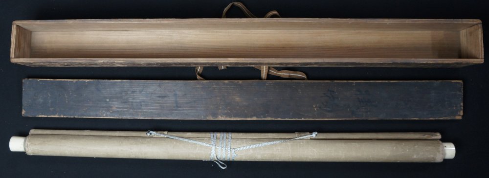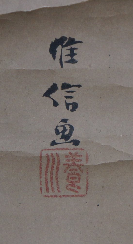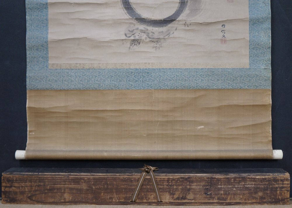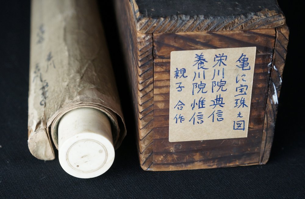 Antique Japan Sumi-e ink art Buddhist Tama and Kame turtle, signed and dated by 2 artists Kano Korenobu and Hakugyokusai (狩野 惟信 - 白玉斎). Nice hand, Sumi-e ink and Fude technique. Medium conditions, some wear from use and exposure. Immediately usable with original wood case, to be handled with care.