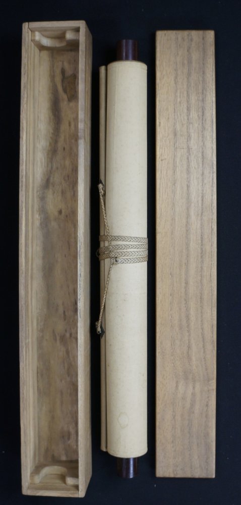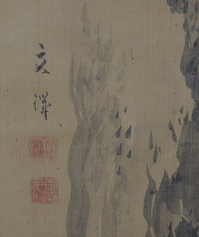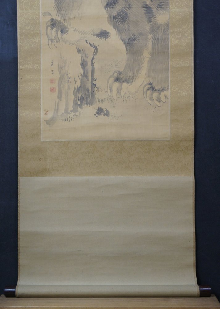 Antique Japanese Nekotora tiger scroll painting on silk, wild tiger composition. Fude brush and ink technique on fine silk. Sealed and signed by artist Bunzen (文禅). Good conditions, light wear from time and usage. Immediately usable in original conditions with protective Kiri wood box.