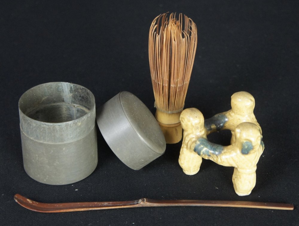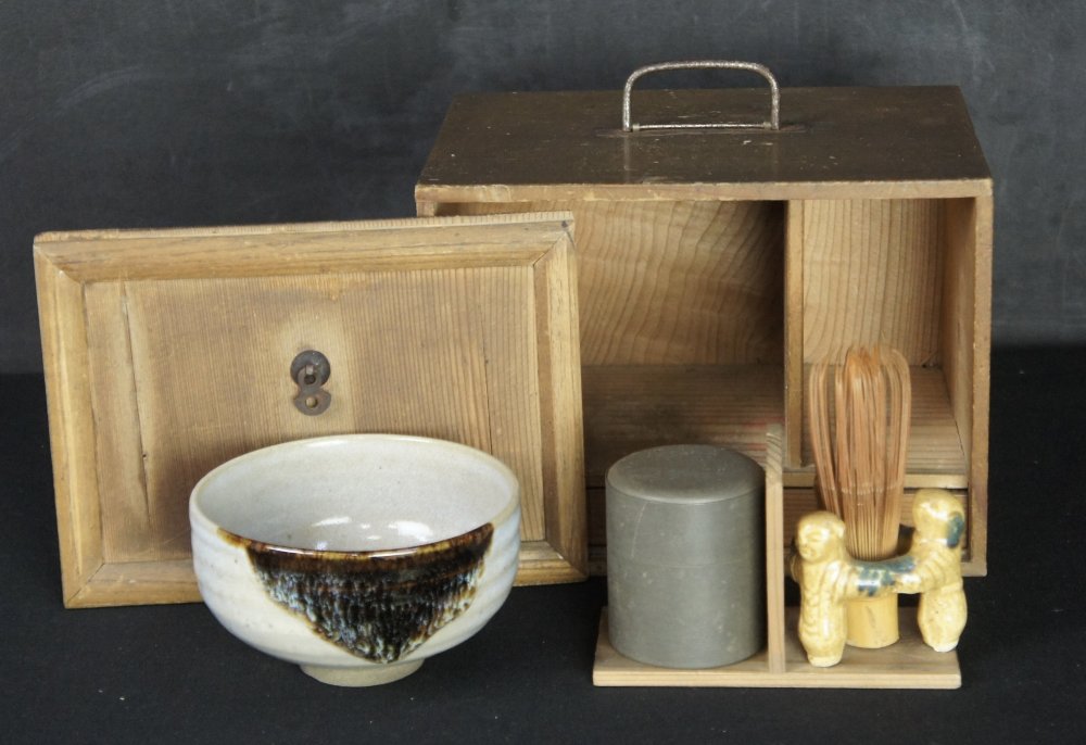 Nice Chabako set for Japanese Tea Ceremony set ceramic Chawan (Oribe ceramic), Futaoki, tin Natsume. Chabako box in medium conditions, wear from time and usage, ceramic bowl in good conditions, immediately usable.