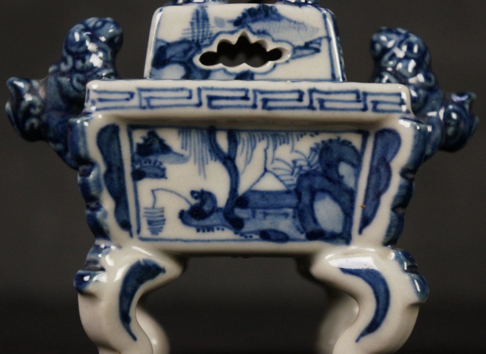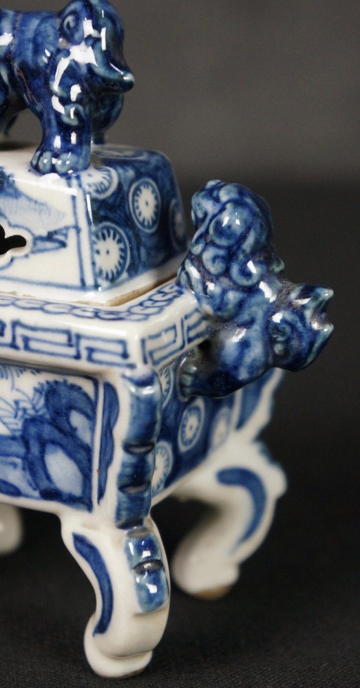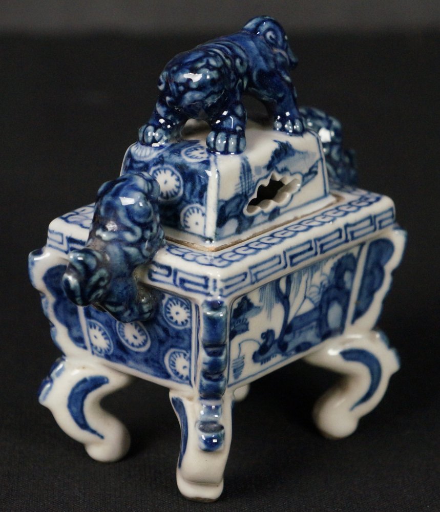 Fine Japanese Sometsuke-Koro ceramic censer, decorated with landscape and geometrical abstract motif, Shihi lion lid, very well preserved with protective wood box, very good conditions, no fractures, no chippings. Immediately usable.