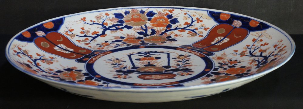 Antique Japanese large banquet Imari enamels technique plate, very large size ceramic 61cm. Decorated with  Spring cherry blossomexuberant and floral motifs. Good conditions, kiln wood fire markings, no chipping no fractures, light wear on surface from usage. Marked on back side by ceramist Tao.