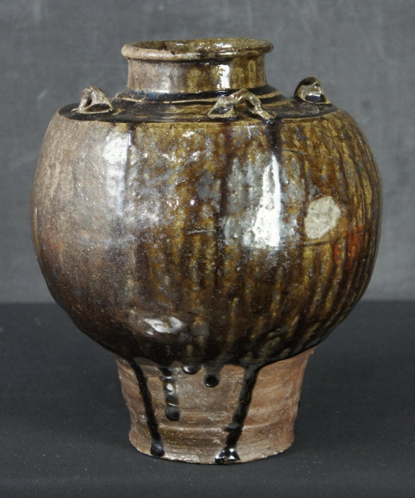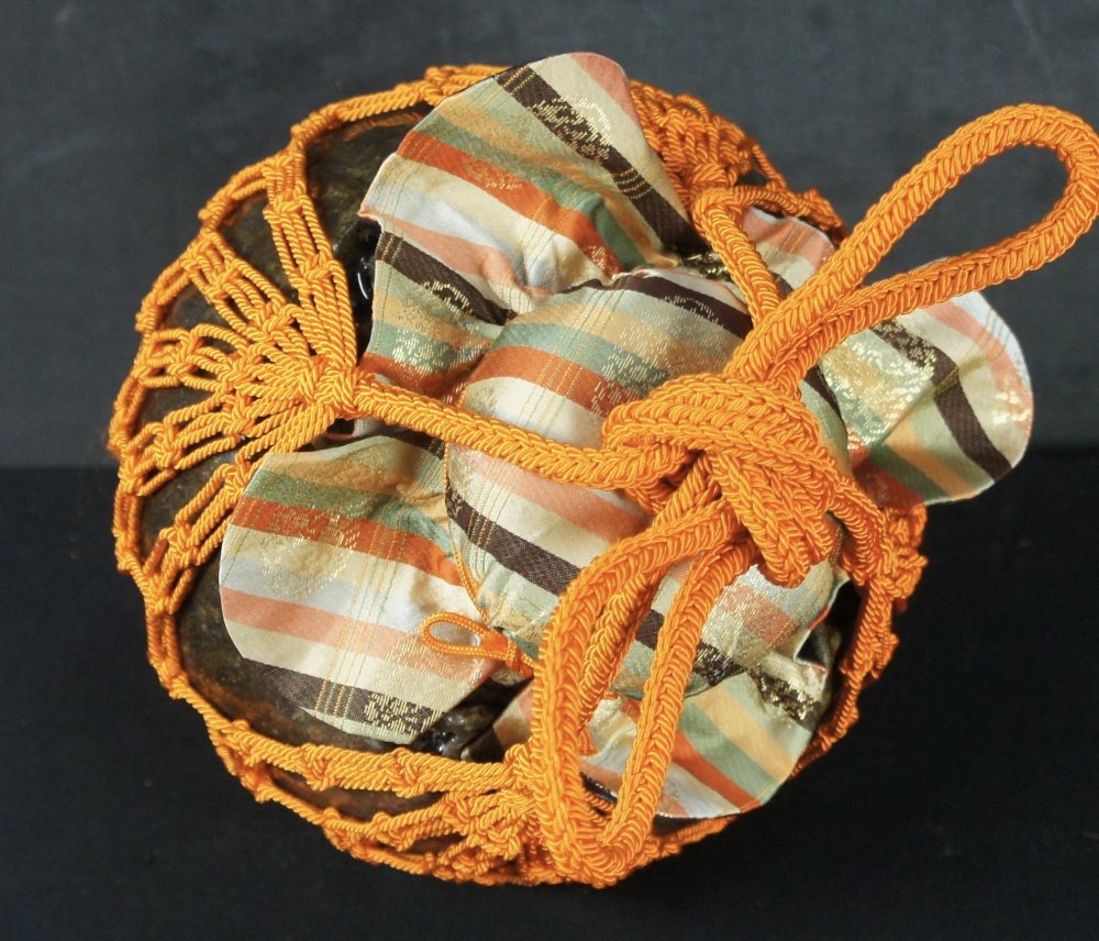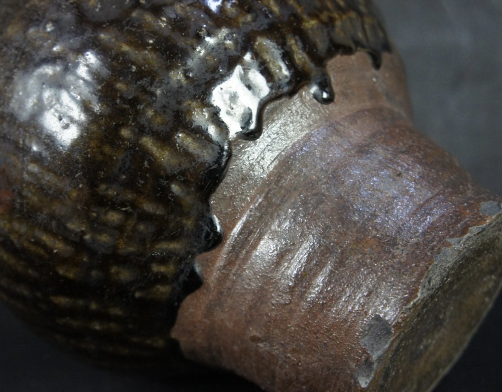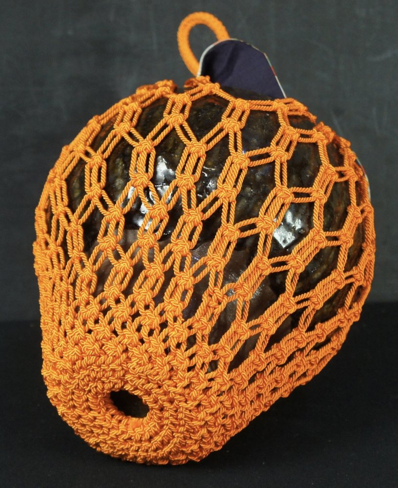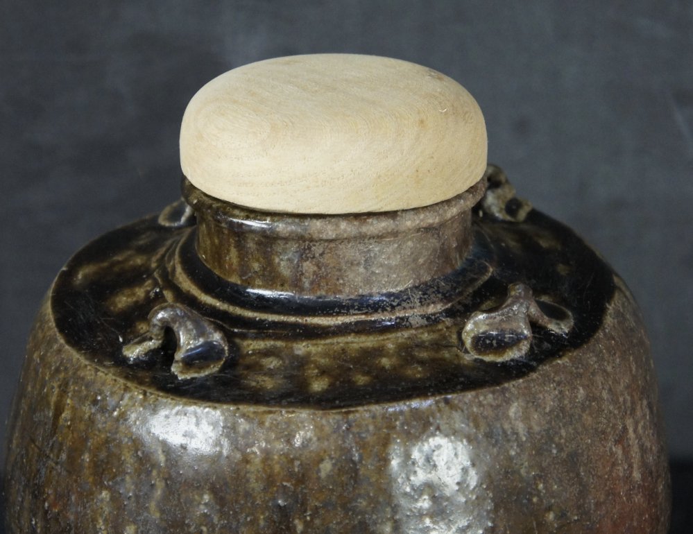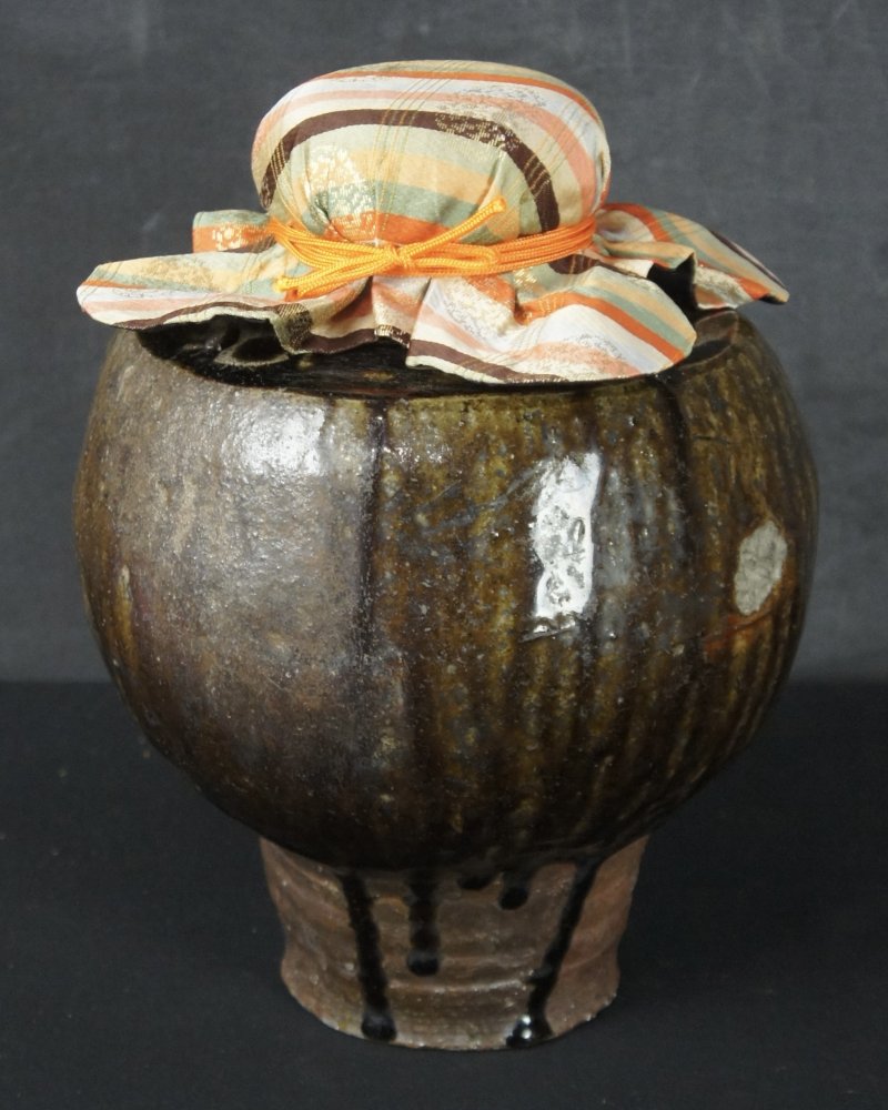 Japanese tea leaf vase Chosen-Yaki tea holder with wood and silk holder. Firing wood kiln markings (Kamakizu), natural ash enamel, wood and silk lid, very nice craft and shape. Immediately usable.