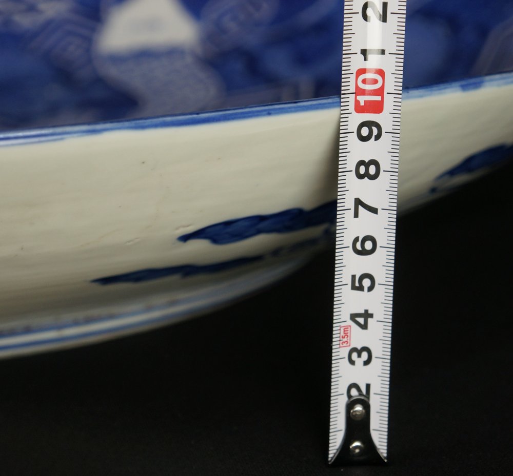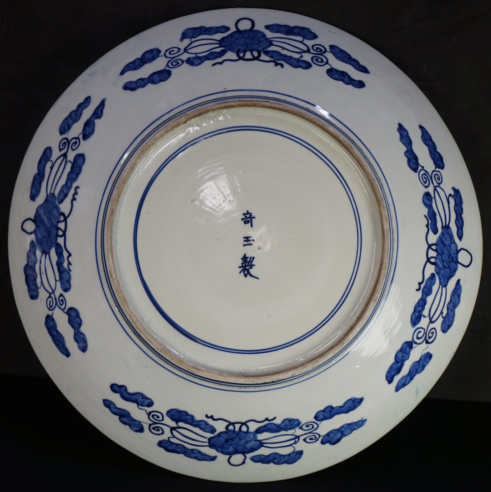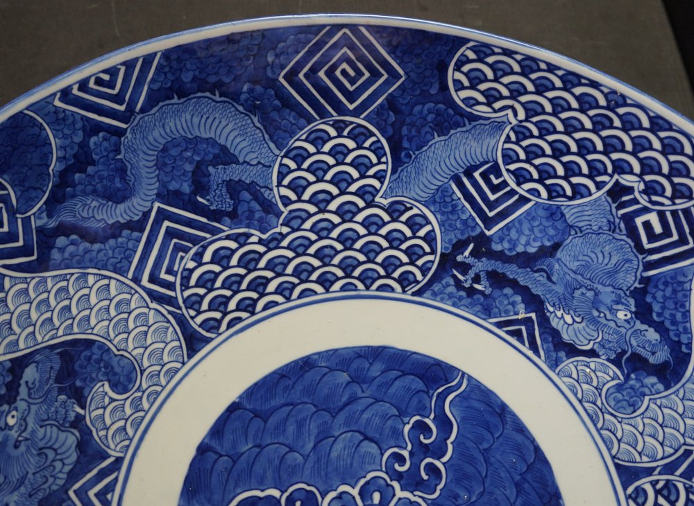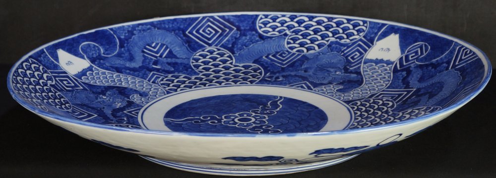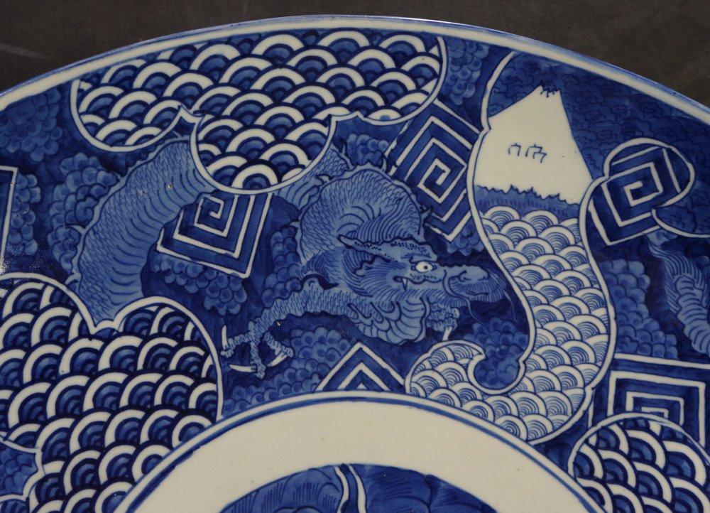 Antique Japanese large banquet Imari Sometsuke technique plate, very large size ceramic 61cm. Decorated with flying Dragon, Fuji landscape, abstract motifs. Good conditions, kiln wood fire markings, no chipping no fractures, light wear on surface from usage.  Signed on back side made by Kyogyoku (竒玉)