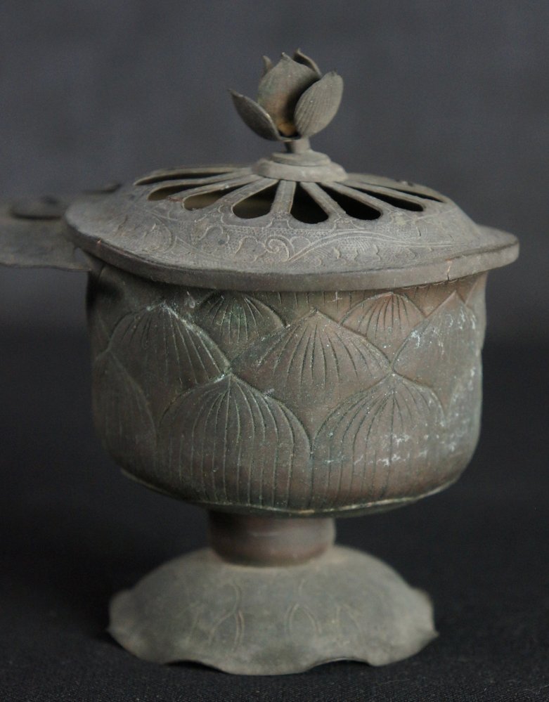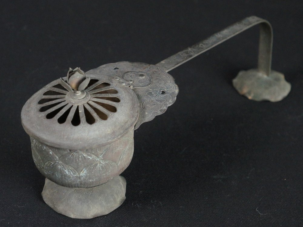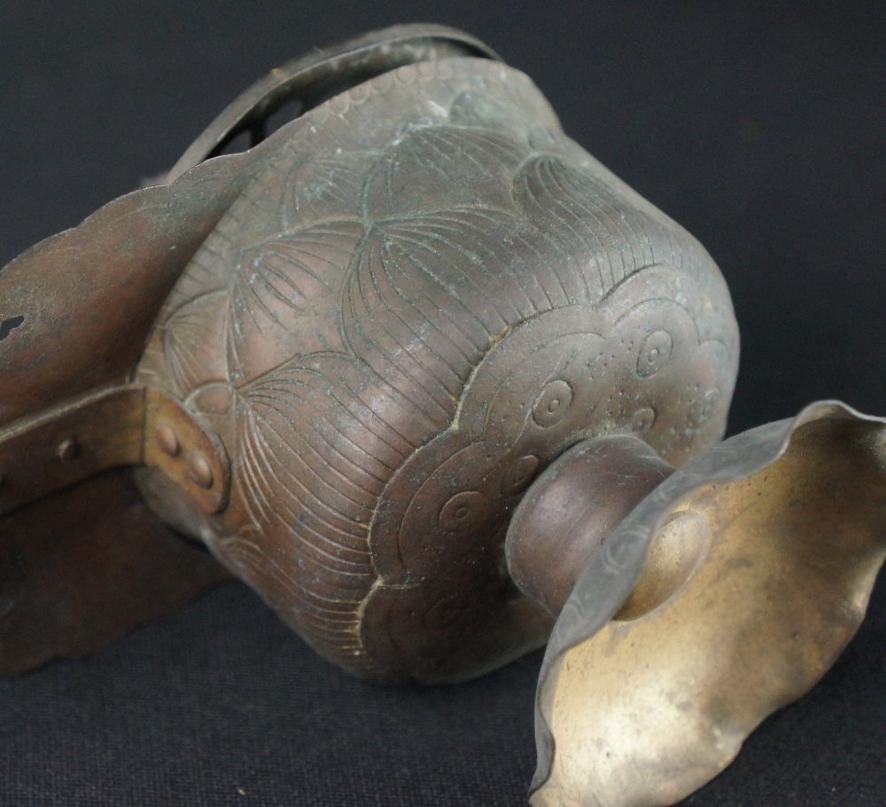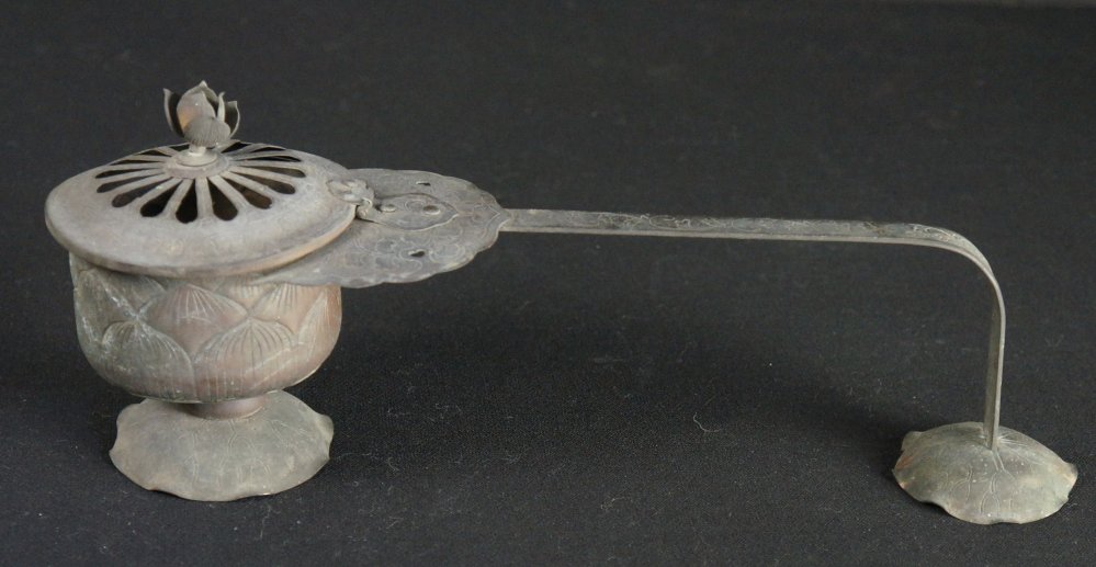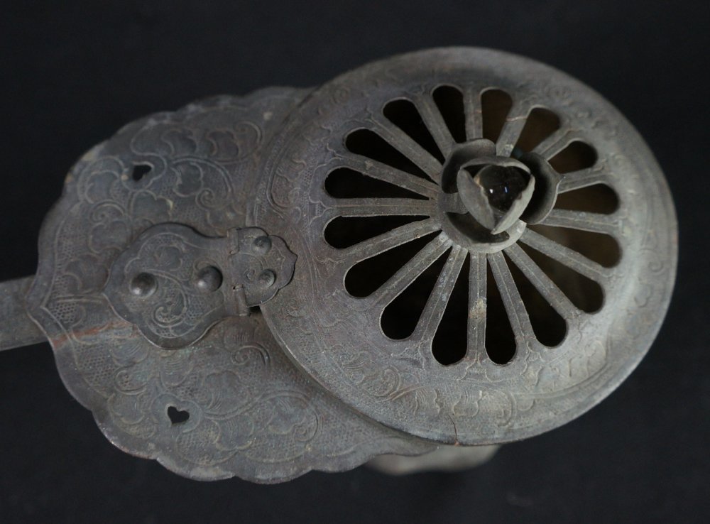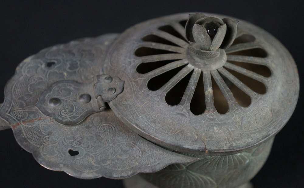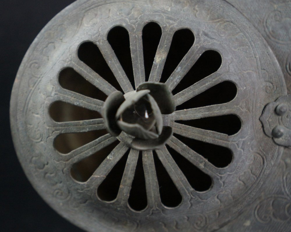 Antique Japanese Mochi-Goro portable censer for Buddhist temple use. Hammered bronze lamina with lotus motif, some of the original gold leaf decoration still partly visible in some areas, top lid cristal/glass ball held by lotus leafs.