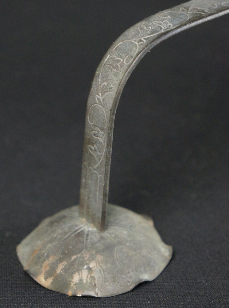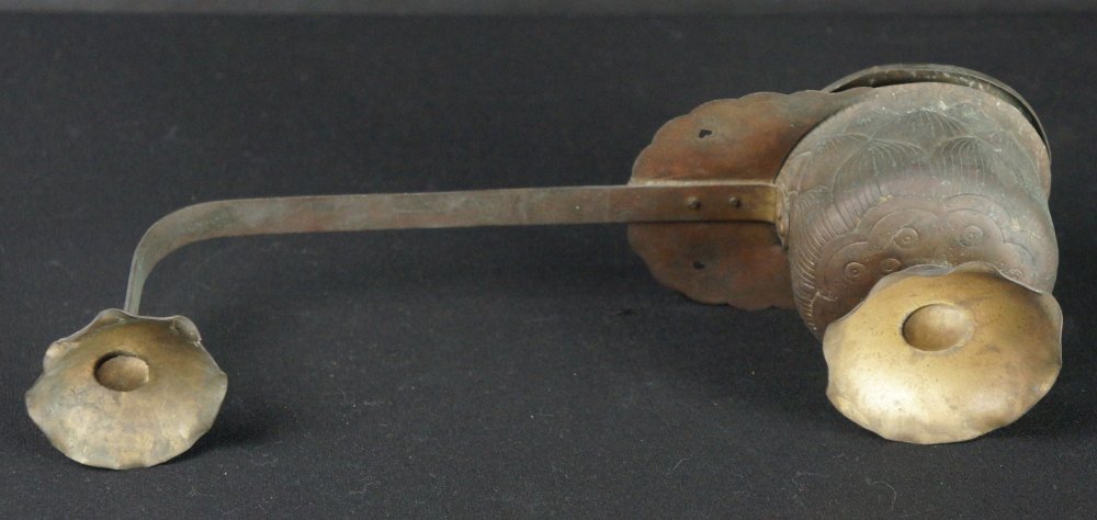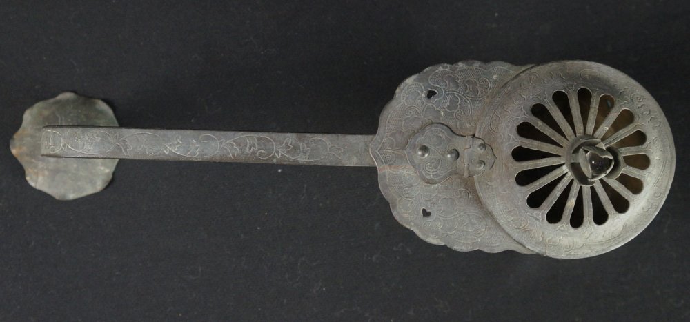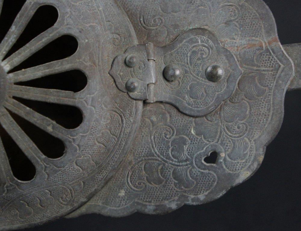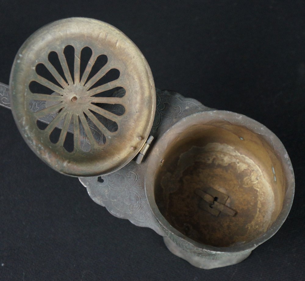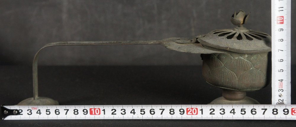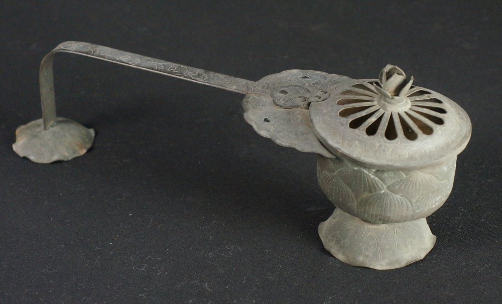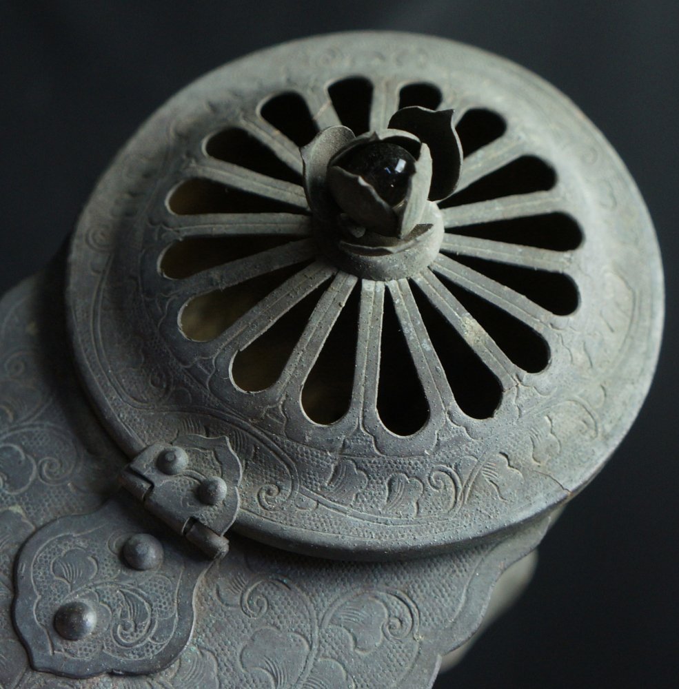 Antique Japanese Mochi-Goro portable censer for Buddhist temple use. Hammered bronze lamina with lotus motif, some of the original gold leaf decoration still partly visible in some areas, top lid cristal/glass ball held by lotus leafs.