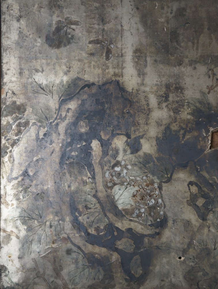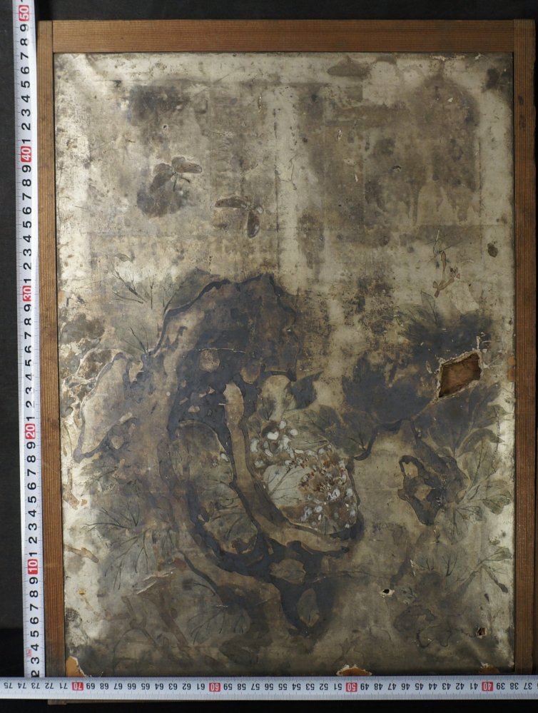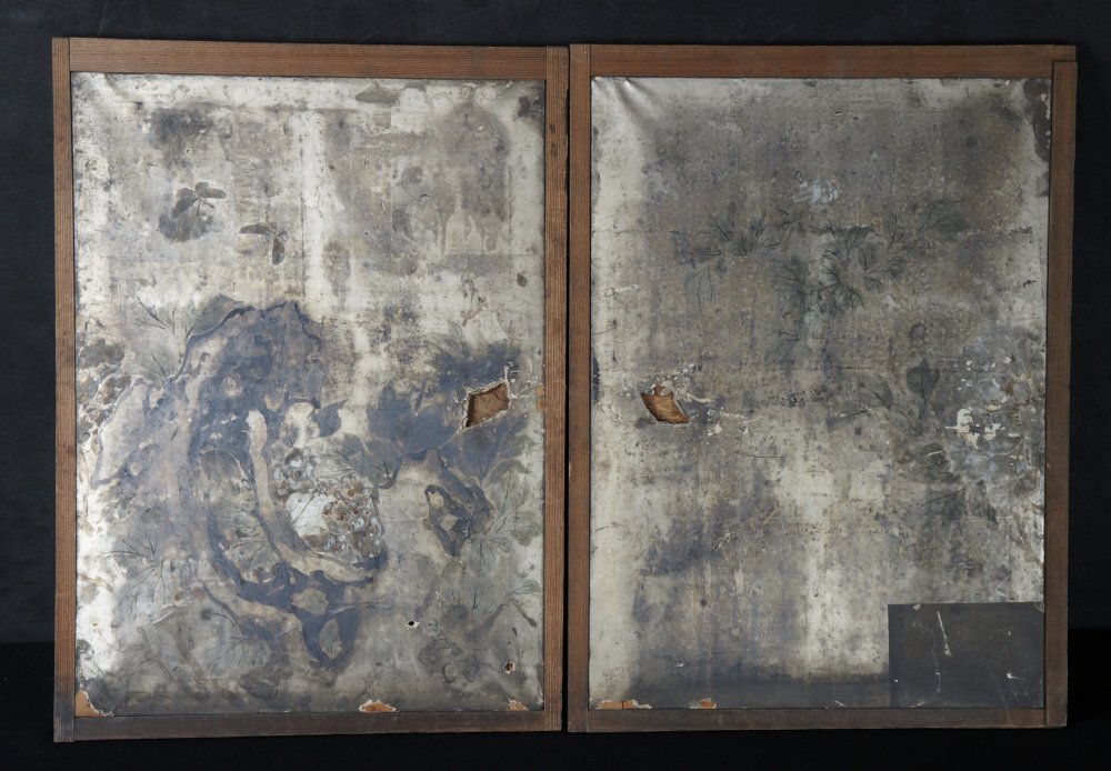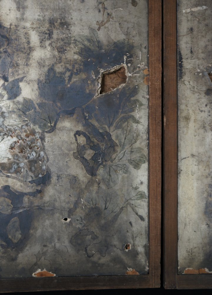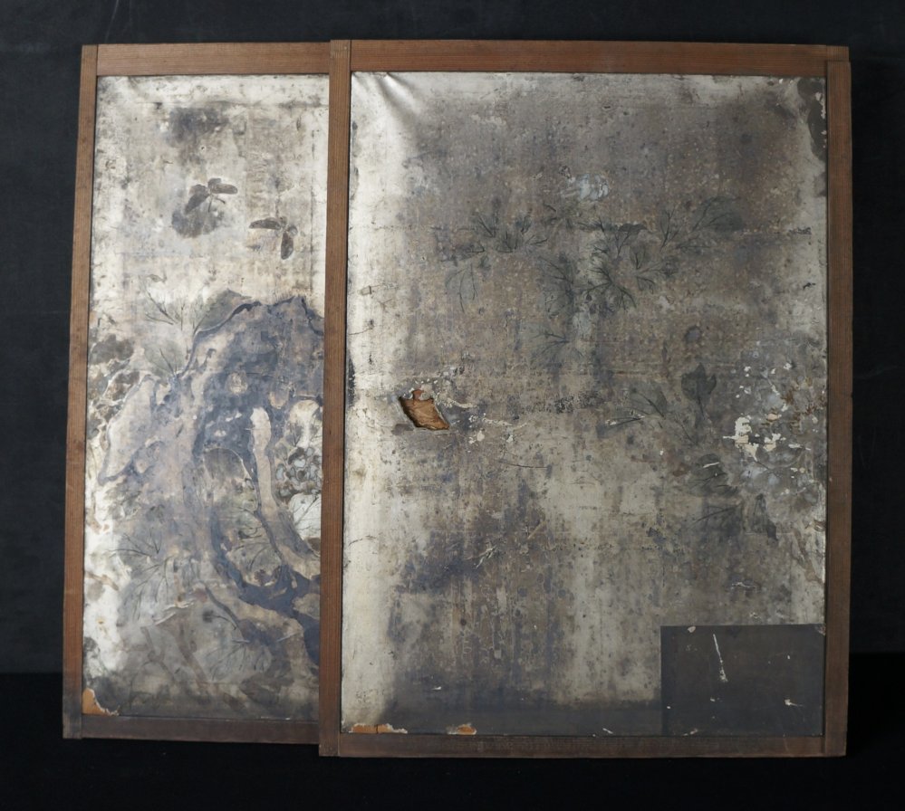Antique Japanese Zen art painting, moon light garden, silver leaf painting, early 1800 Edo era, 2 panel painting from Japanese Tokonoma room. Poor conditions, extensive wear from use and time, insect erosion. Silver leaf surface oxidated, original ink painting still partly visible. Antique Edo era Tokonoma sliding panels.