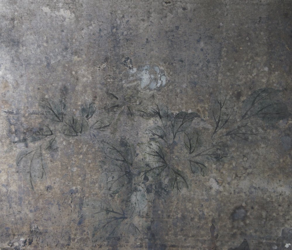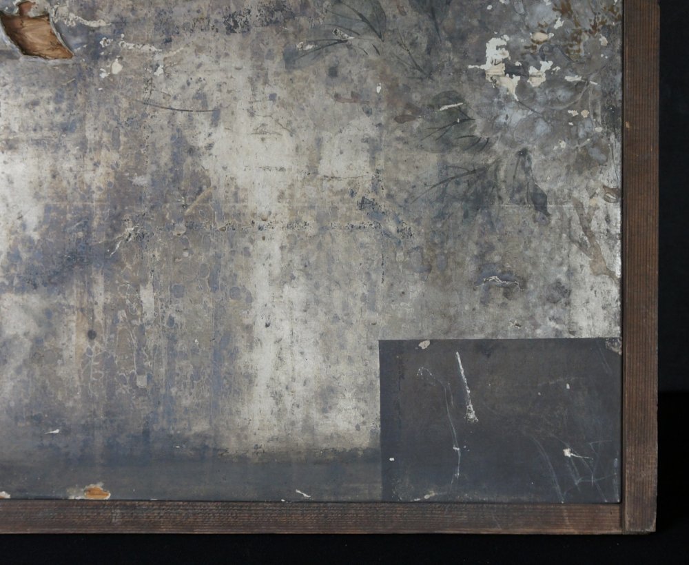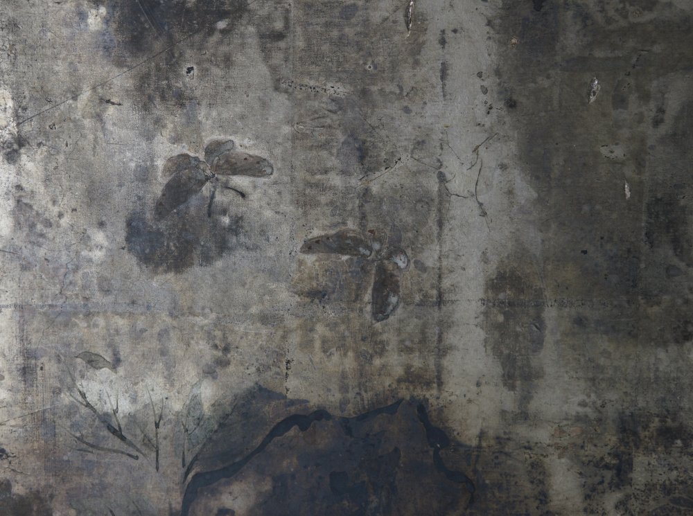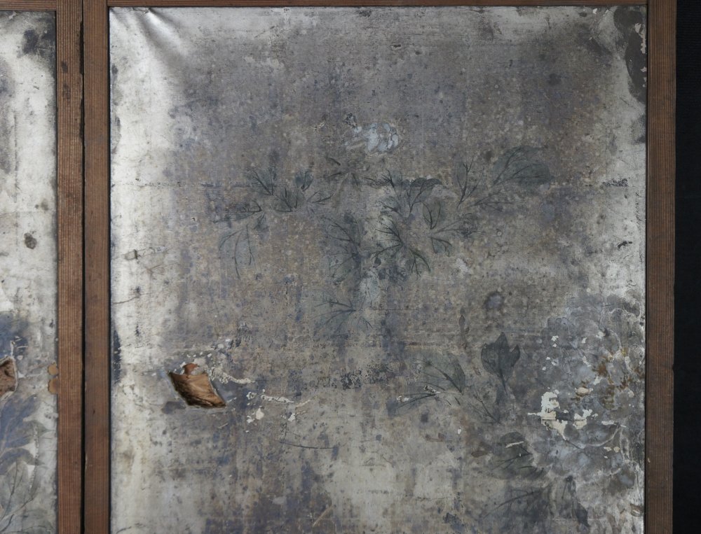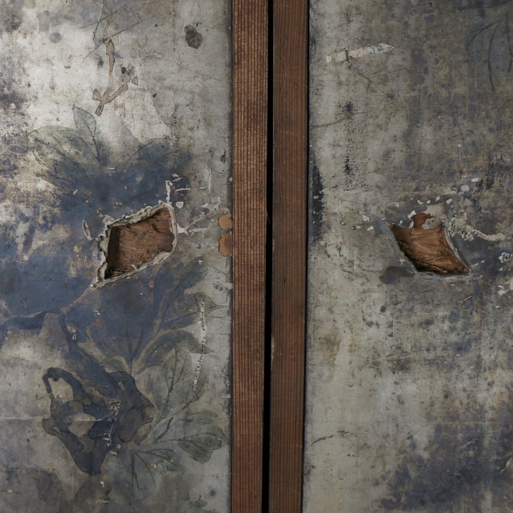 Antique Japanese Zen art painting, moon light garden, silver leaf painting, early 1800 Edo era, 2 panel painting from Japanese Tokonoma room. Poor conditions, extensive wear from use and time, insect erosion. Silver leaf surface oxidated, original ink painting still partly visible. Antique Edo era Tokonoma sliding panels.