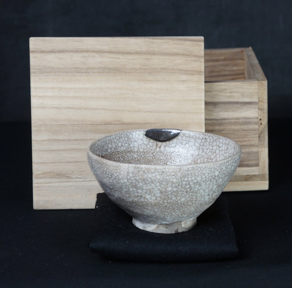 Nice Shino Chawan tea bowl with old Gintsuki silver estoration on rim. Nice shape and surface, minimalist, very nice character. Shino kiln craft bowl Tenmoku-Chawan shape, good Gintsuki silver restoration. Some wear from usage and time. Immediately usable with protective Kiri wood box.
