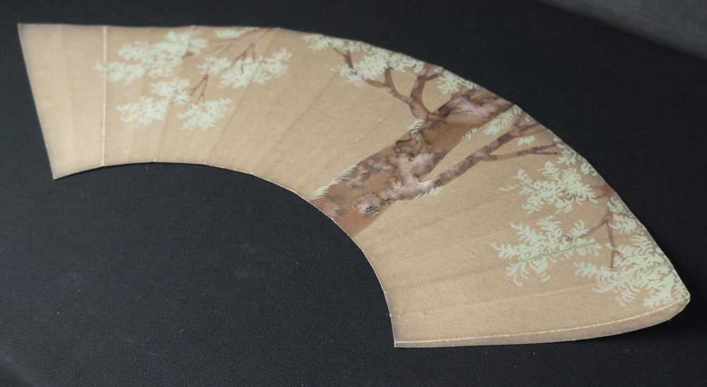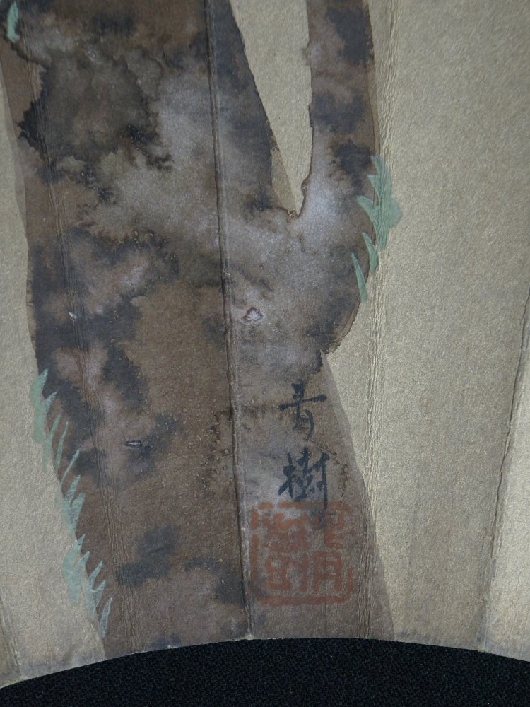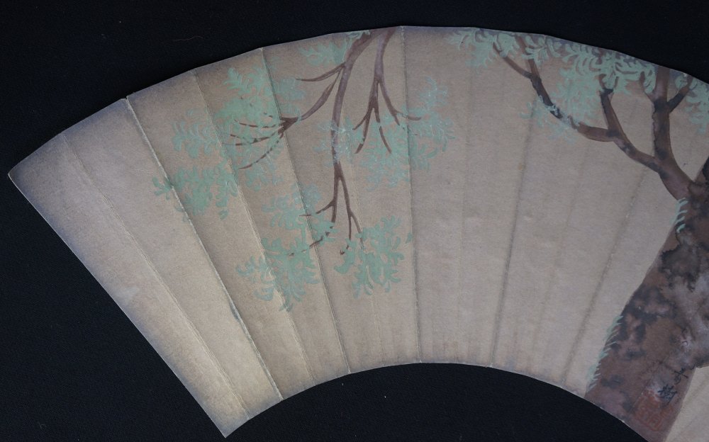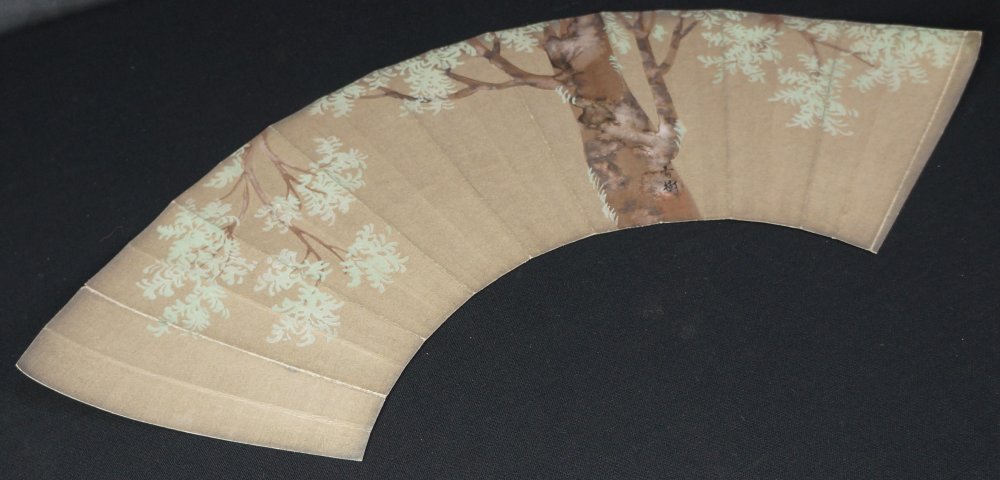 Antique Japanese Sensu painting, tree with gold background, paper gold leaf and watercolor technique, medium good conditions, Artist sign sign Seki (青樹). Some wear from time and handling. Please see all detail photos, nice antique decorative Japanese art.
