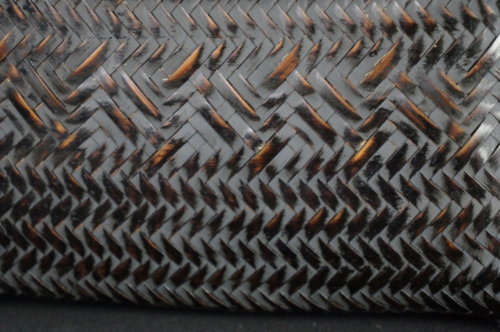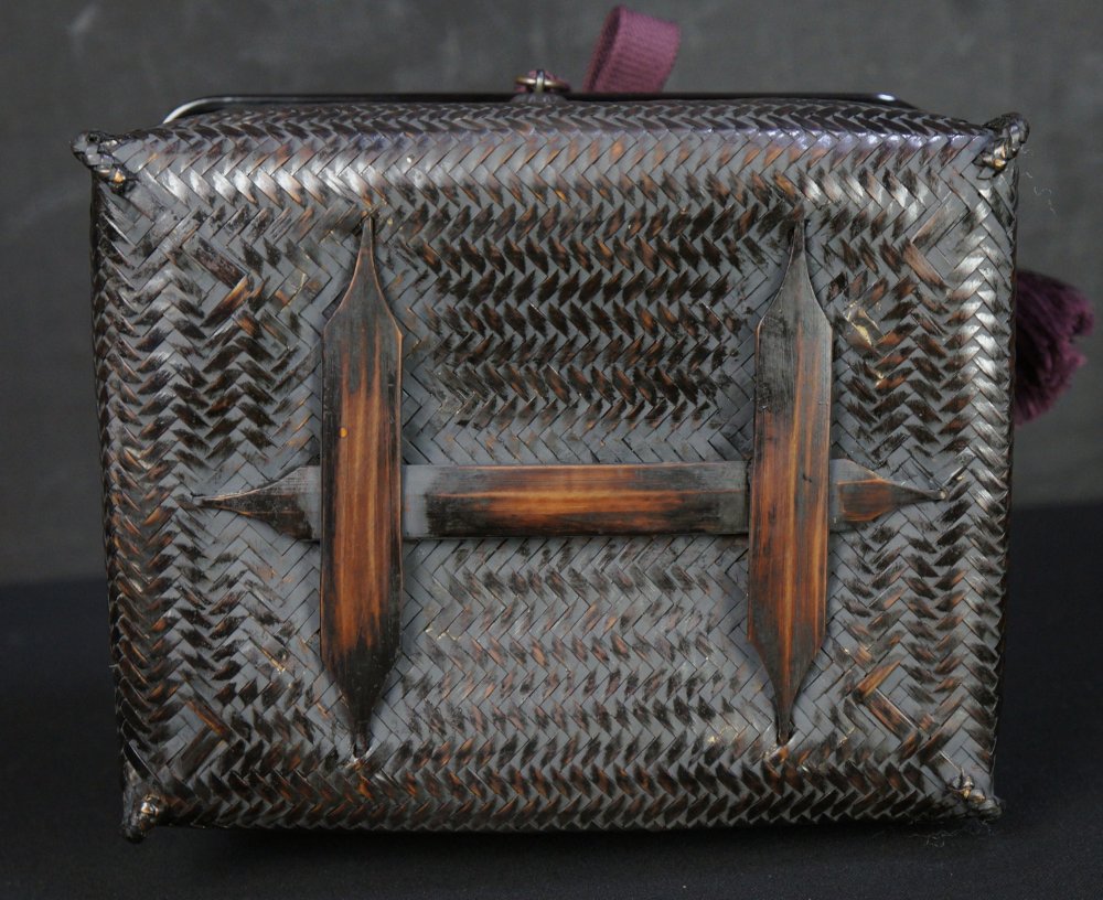 Japanese fine Chabako portable tea set made from woven bamboo with lacquer finishing complete of bronze Himo silk string holders and original protective wood box. Fine craft by Kurita Motochiku (栗田元竺).  Very good conditions, light wear from usage ant time on surface. Immediately usable, nice work of art.