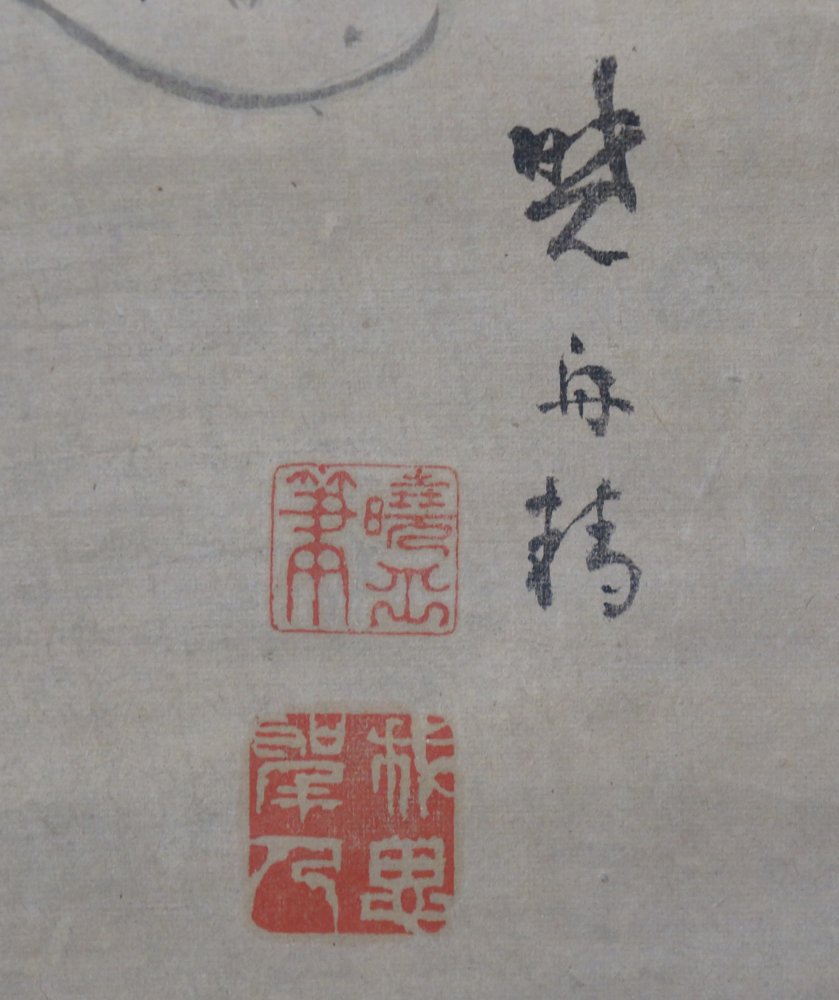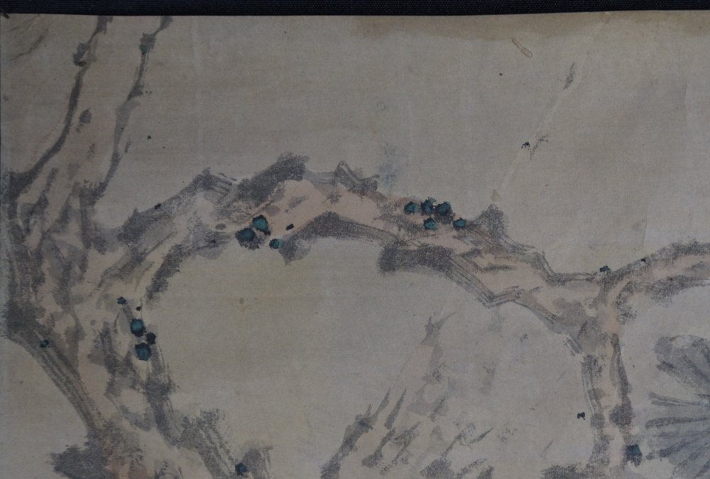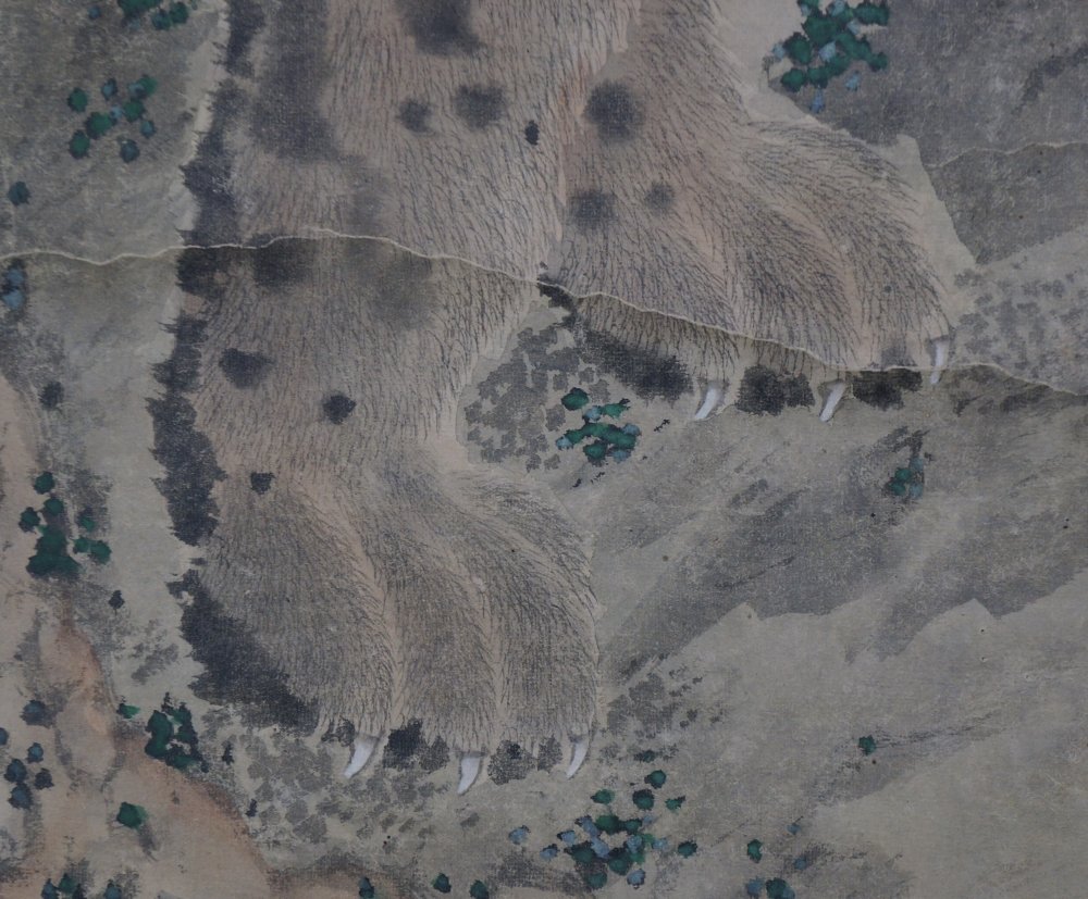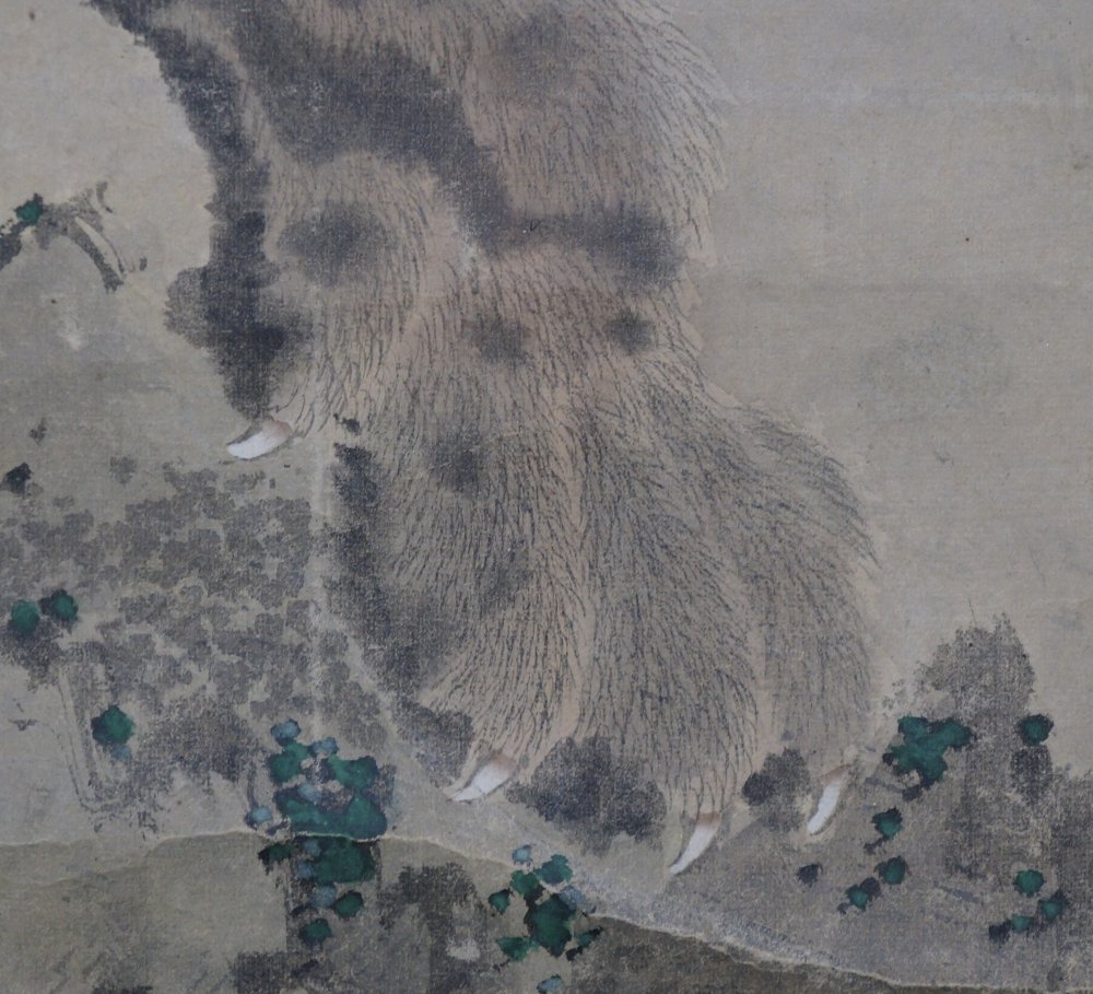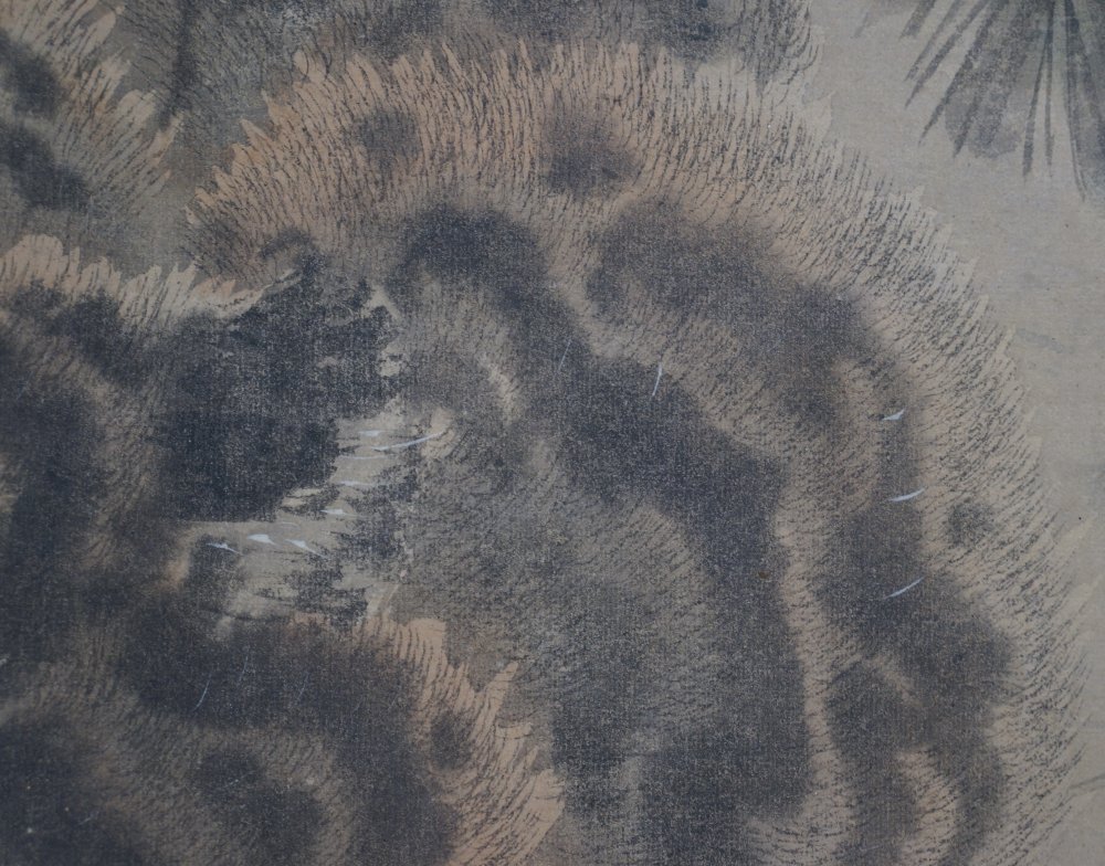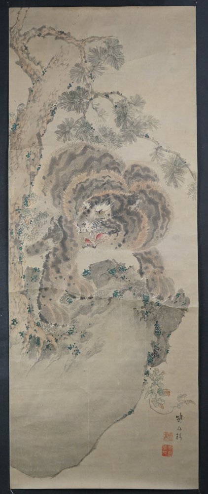 Antique Japanese Nekotora tiger painting on paper, tiger composition among rocks and Matsu tree. Fude brush and ink technique watercolor on fine Washi paper. Sealed and signed by artist Gyoshu (曉舟). Good conditions, some wear from time and usage. Immediately usable.