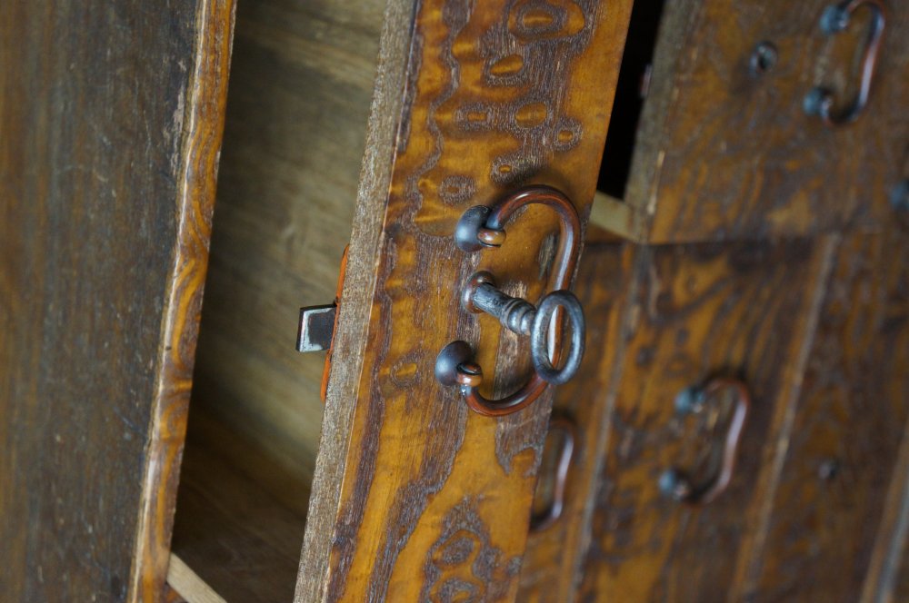 Hikidashi-Dansu Japanese furniture made of solid wood with Keyaki wood front decoration, natural finishing surface. Bronze handles and all working locks with key. Composed of 8 draws. Some wear from usage and time, in original conditions as found. Immediately usable, please see all photos.