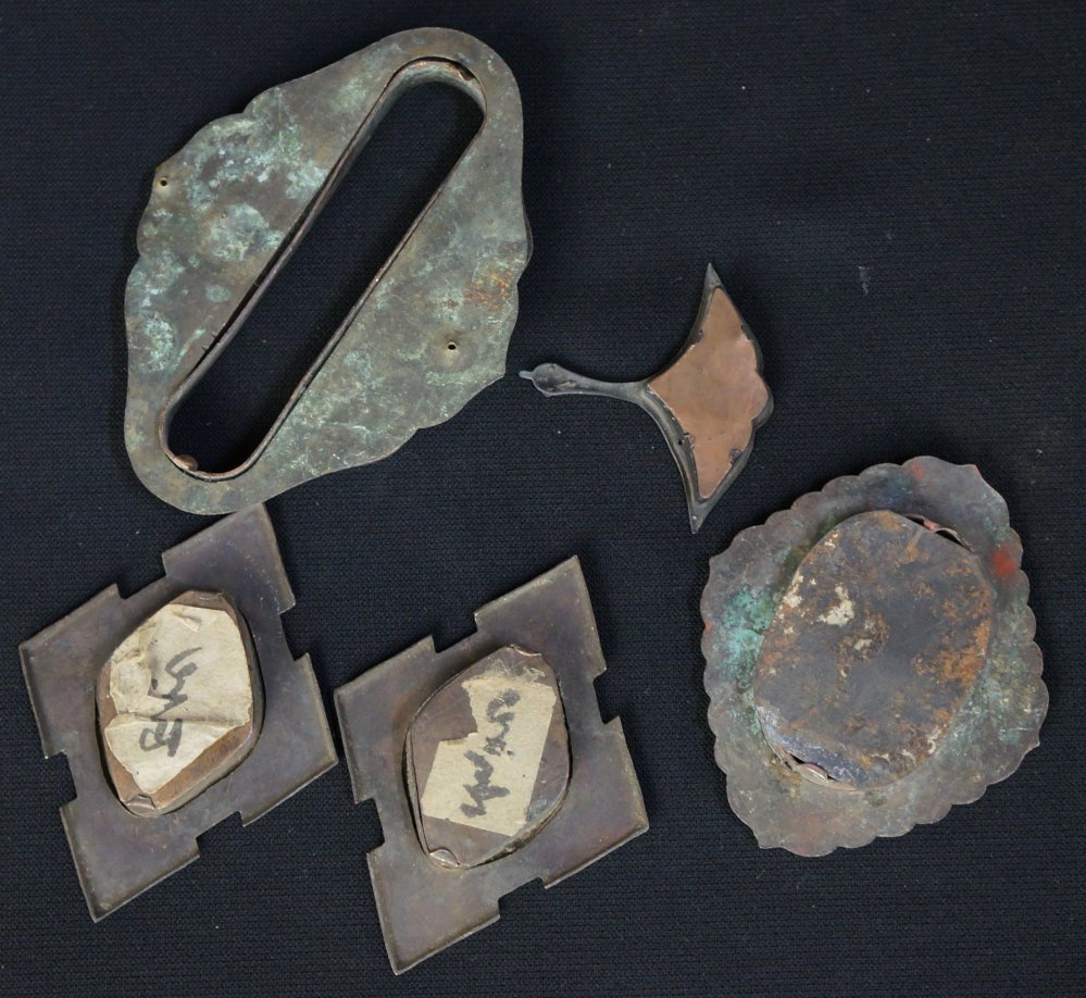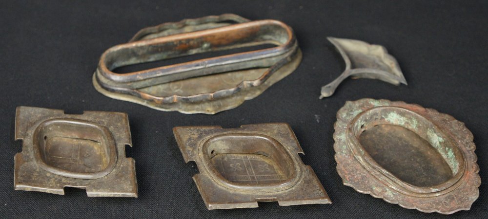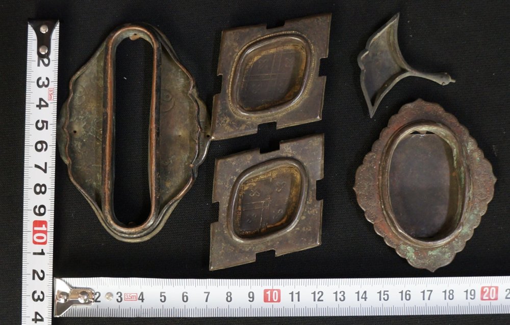 Antique Japanese bronze Hikite sliding panel handles, total of 5, medium good conditions, hand craft some gold guild color visible. Wear from long usage, immediately usable.