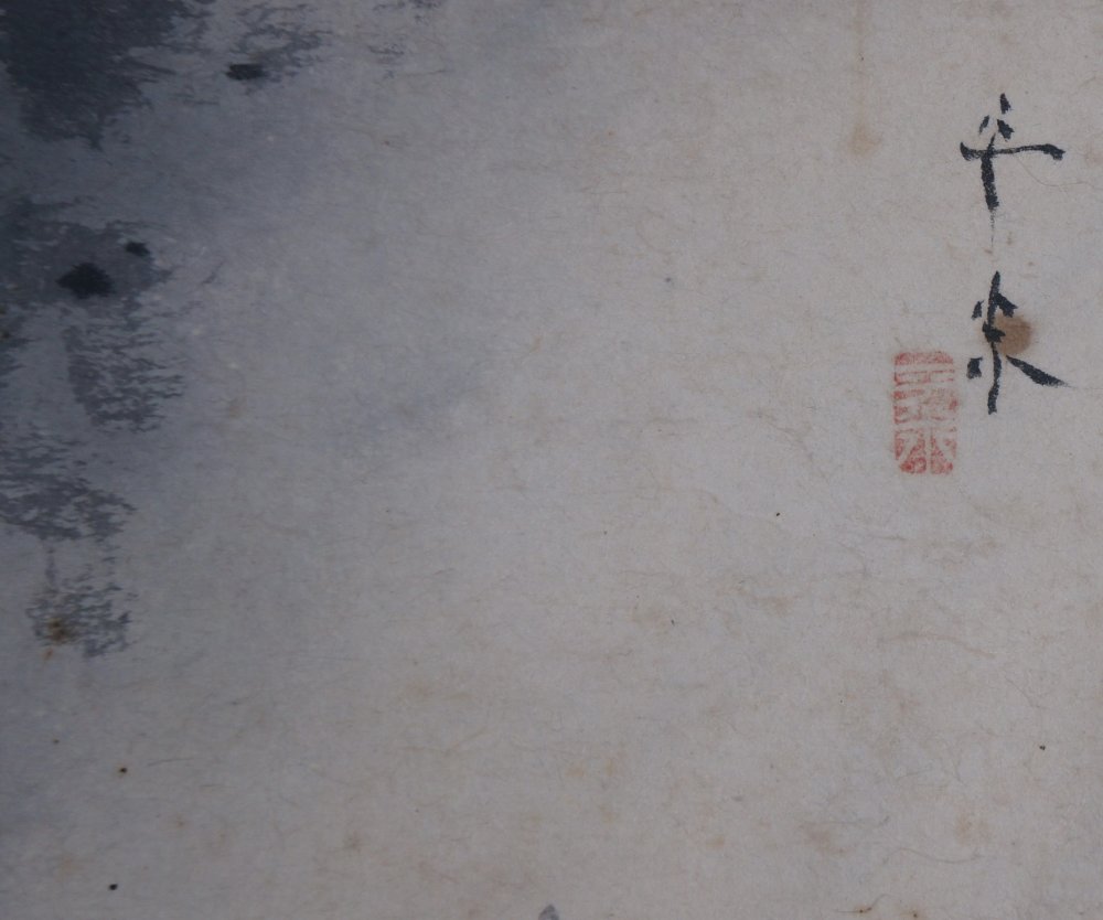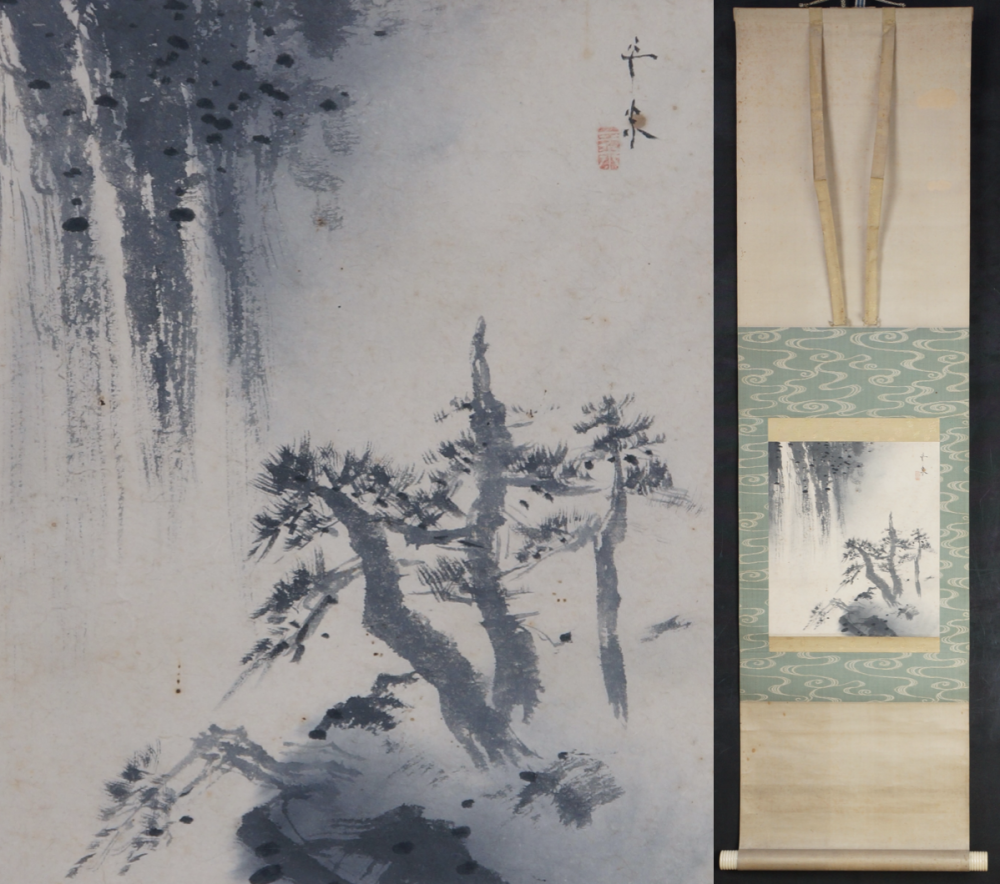 Japanese paper scroll hand painted Zen Sumi-e ink art, rural mountain waterfall and Matsu trees, minimalstic composition. Fude brush and ink tecnique on paper, signed by Hiranaga (平永), nice hand, medium good conditions, some wear from time and handling, please see photos.