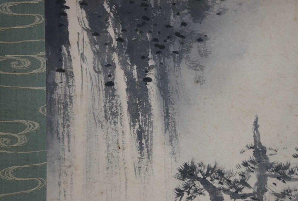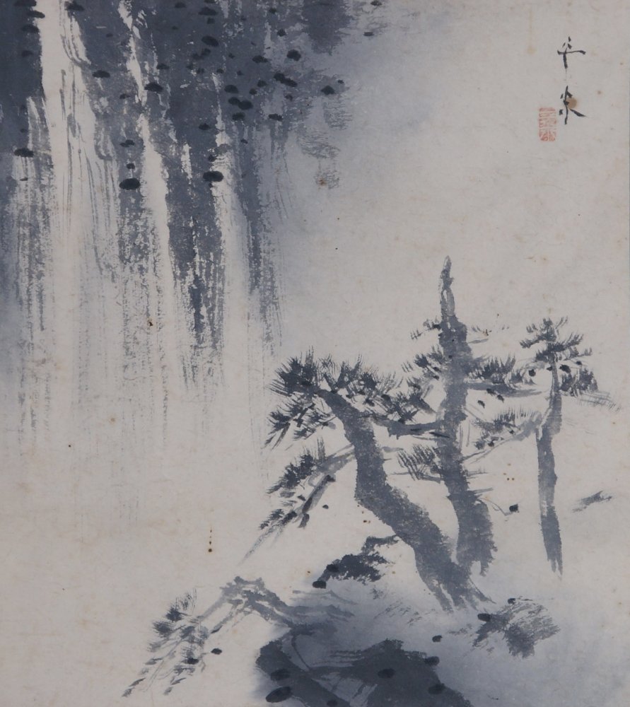 Japan Zen painting waterfall and Matsu Sumi-e ink art 1900 Minimalist landscape
