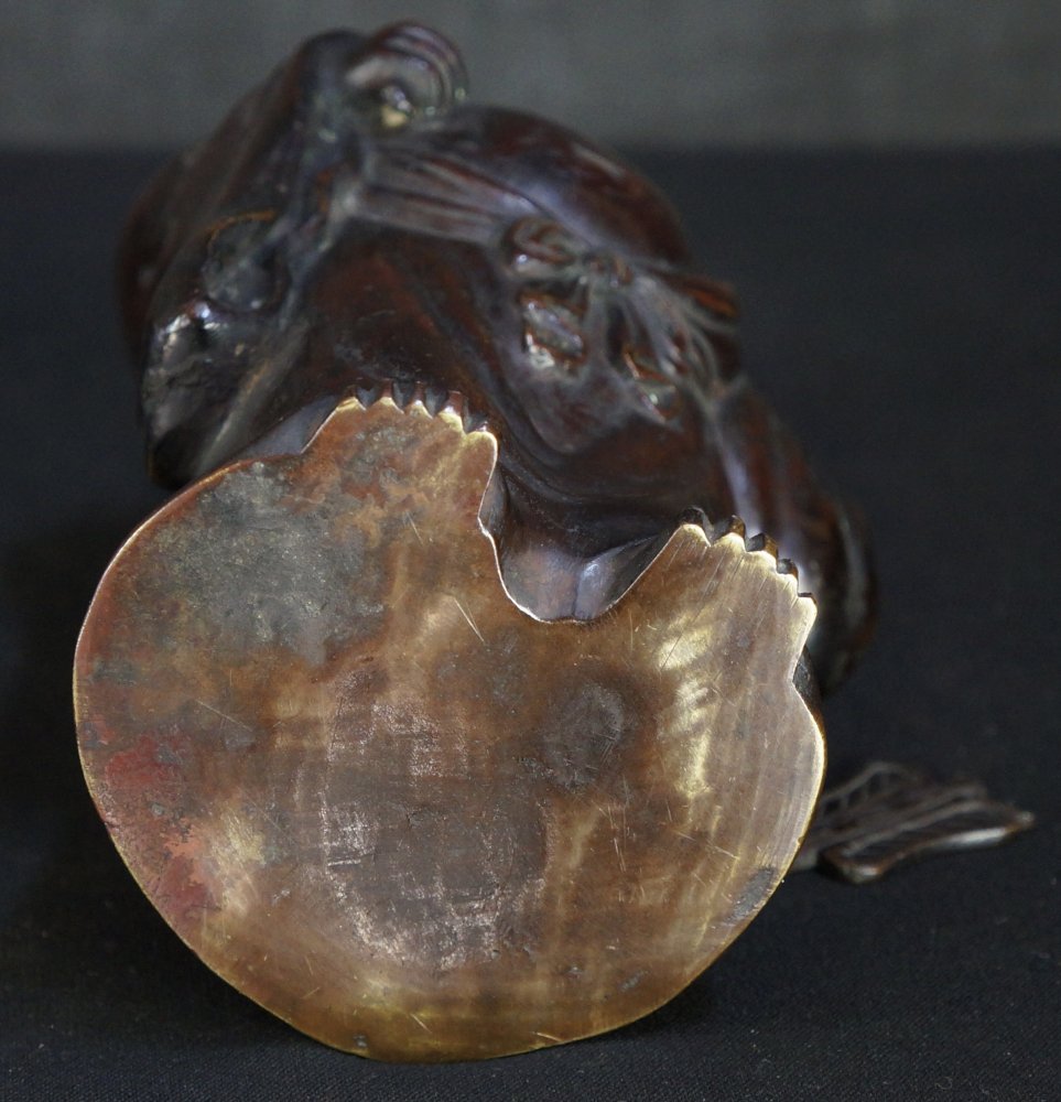 Antique Hotei-sama fortune deity Japan sculpture lost wax technique craft, chiseled details, nice patina. Makers sign on back Kawara Kamoto (瓦ヵ可元?). Well preserved, some wear from long usage and time, immediately usable.