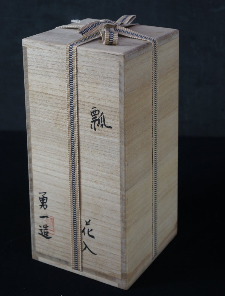 Japanese minimalist ceramic Hanaire floral vase Hyotan shape, good conditions Kiln fireing markings on bottom, makers seal and sign on protective wood box by Sakakibara Yuichibu. Immediately usable.