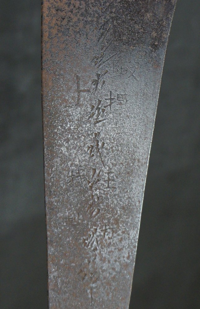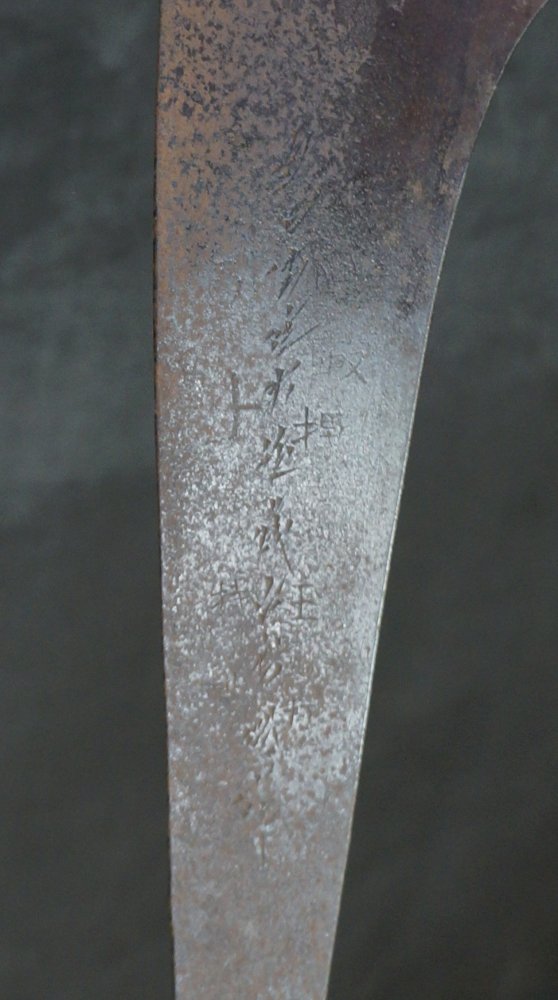 Antique Japanese ice saw Nokogiri tool hand forged and hammered, makers markings on one side by handle, wear and oxidation. Medium conditions, wear from long use.