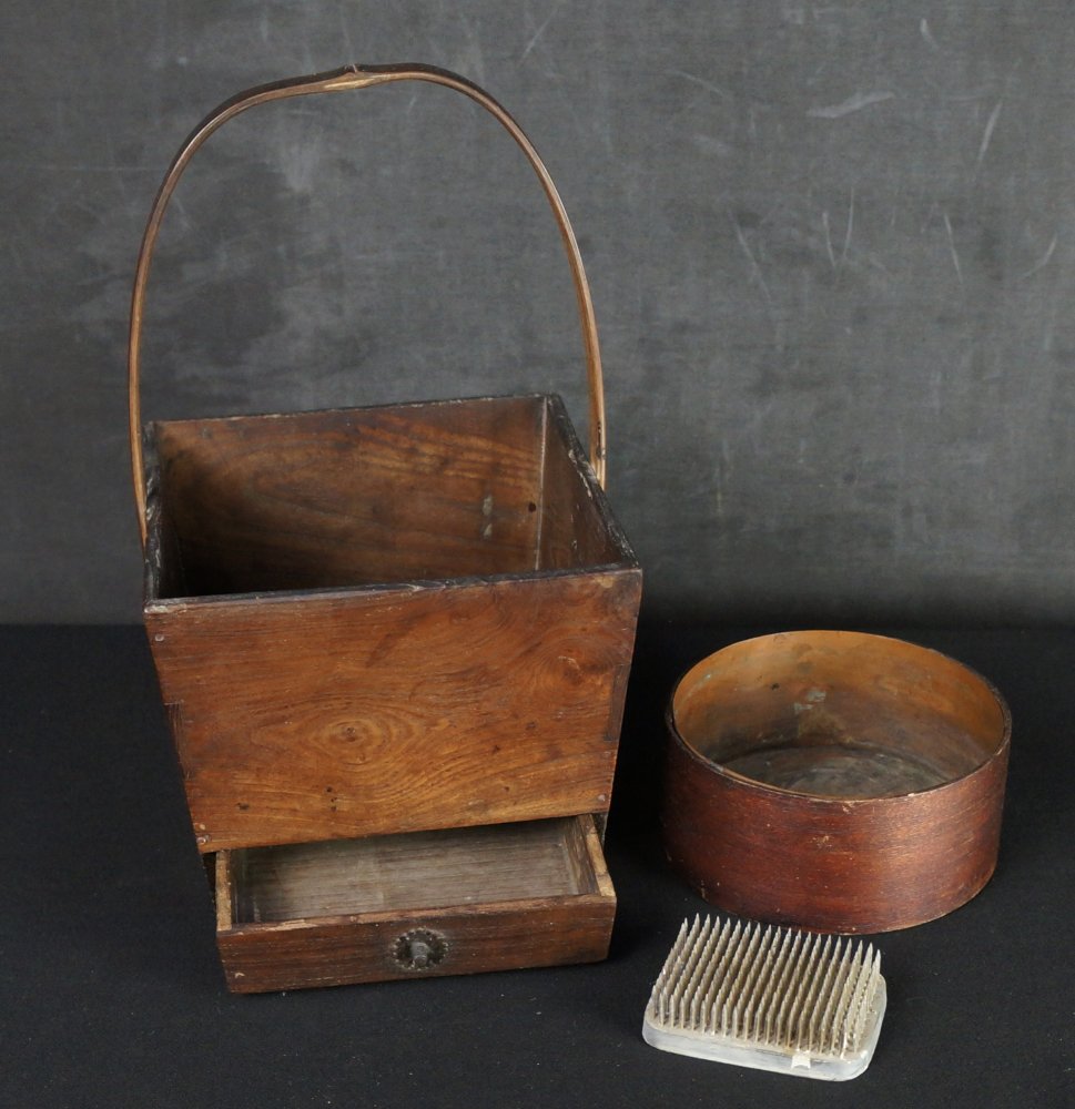 Wabisabi Japanese minimalist Suiban Ikebana floral compositions tray. Made from wood tray with drawer and copper water tight basin complete of metal Kanzan for floral stems. Medium good conditions, some wear from long usage ant time, usable for dry or wet floral compositions. Immediately usable.