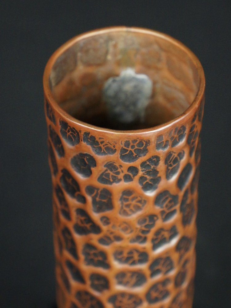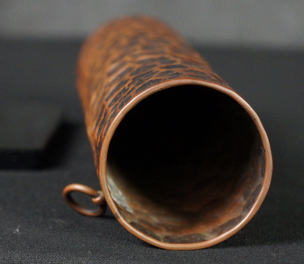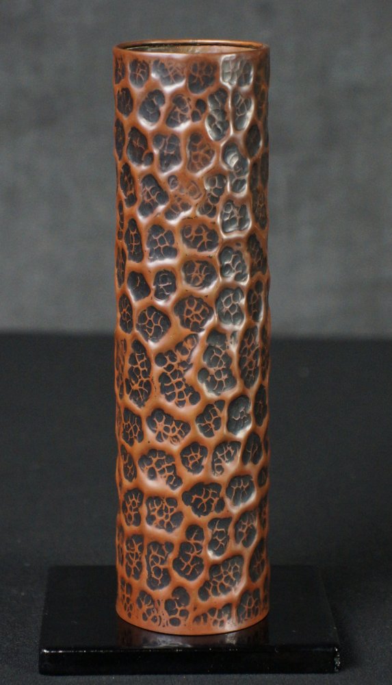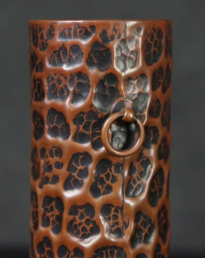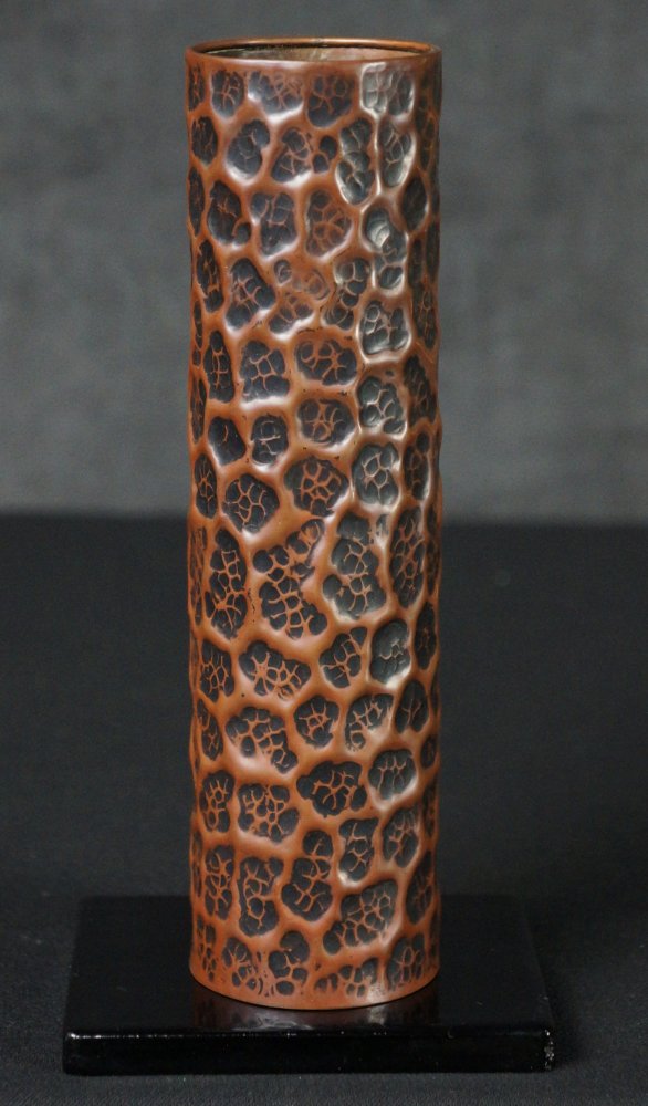 Japanese wall hanging vase for Ikebana minimalist compositions, table top or wall hanging vase. Han hammered copper, sealed on bottom by Tamagawa. Good conditions, water tight with with lacquered wood base, immediately usable.
