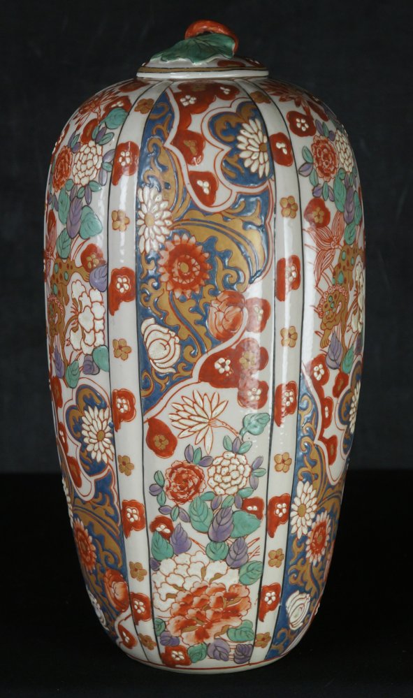 Antique Japanese Ko-Imari ceramic vase Tsubo container, decorated with Imari floral enamel s and Shishi lions motif, nice shape, wood kiln markings on surface, Marked by maker on bottom Imari (伊万里). Some wear from usage and time, no fractures, no chipping, old restoration on top lid handle. Historical ceramic with Kiri wood protective box.