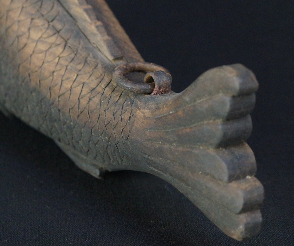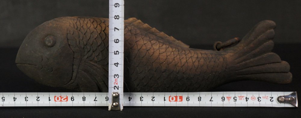 Antique Japanese Koi carp wood carving from Jizai kettle holder, good conditions, carved from single block of wood. Some wear from long usage used and time. Nice character and  patina with natural wood aging markings, iron ring.