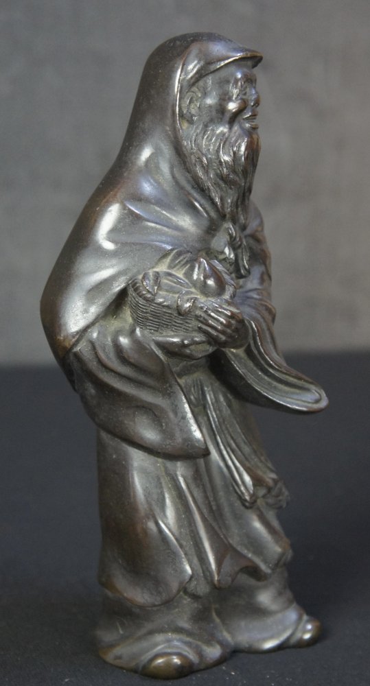 Nice antique Japanese bronze Jurojin fortune deity of longevity, wisdom depicted with wind blow garments and holding a bascket of peaches symbolizing eternal life. Nice bronze craft, lost wax technique bronze sculpture. Artist seal on bottom not distinguishable iside square nich. Good conditions with nice patina, no broken parts. Immediately usable.