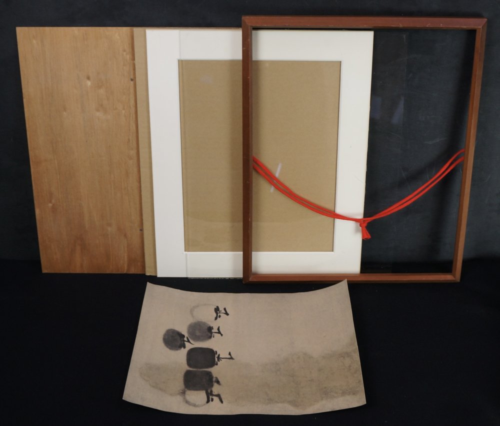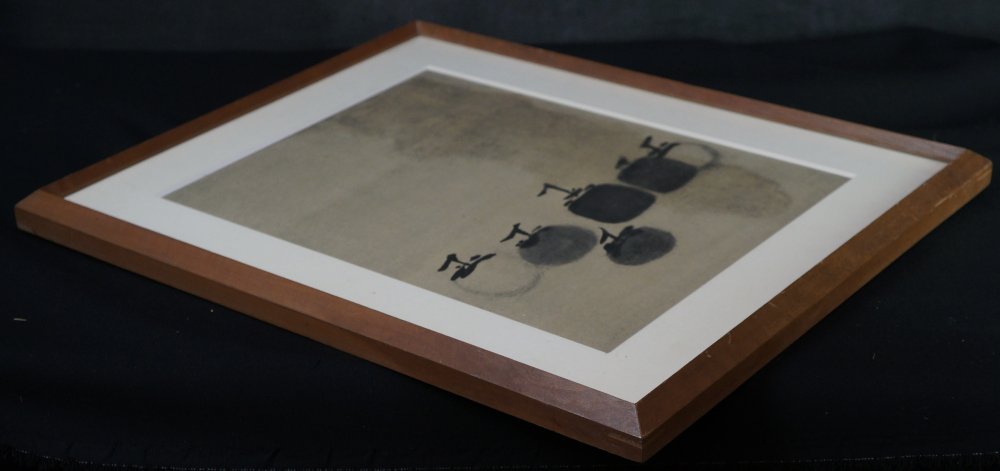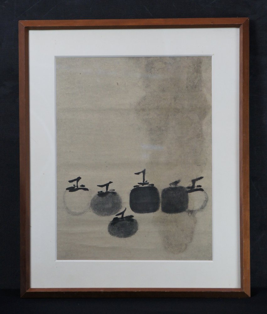 Japanese minimalist Zen painting, still nature Kaki persimmon composition, Sumi-e ink technique. Nice Minimal depiction of persimmon allegory of autumn abundance, Wood  frame and glass, good conditions, light wear from time and handling.
