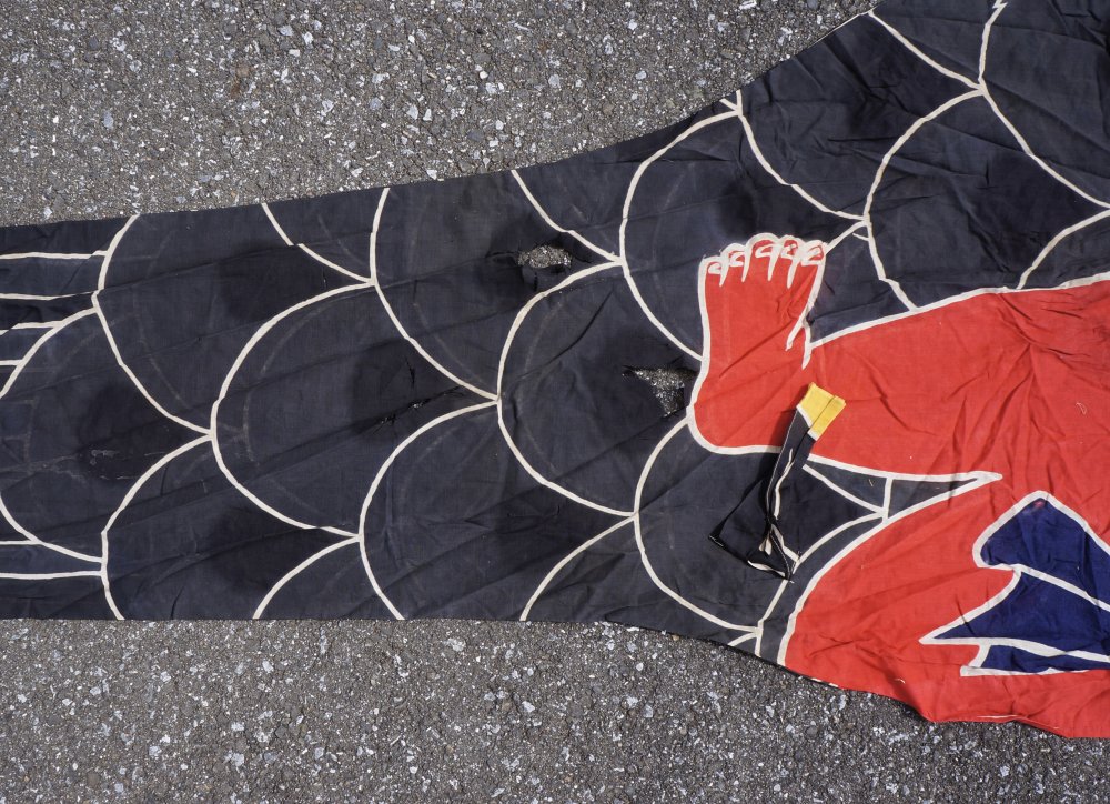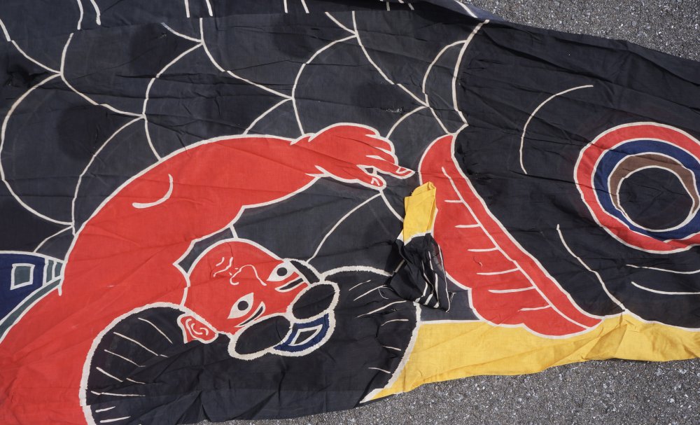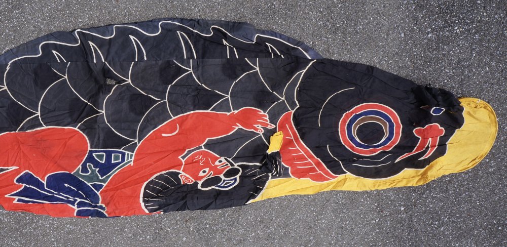 Vintage Japanese Koi-Nobori carp flag and Kintaro hand made dye, rural Japan craft kite in the shape of carp fish with Kintaro Japanese folklore.