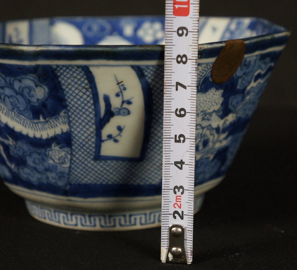 Antique Japan bowl plate, hand decorated with nice blue pigment dragon motif, good condition Kintsuki restoration, some wear from usage, wood kiln firing marks. Immediately usable.