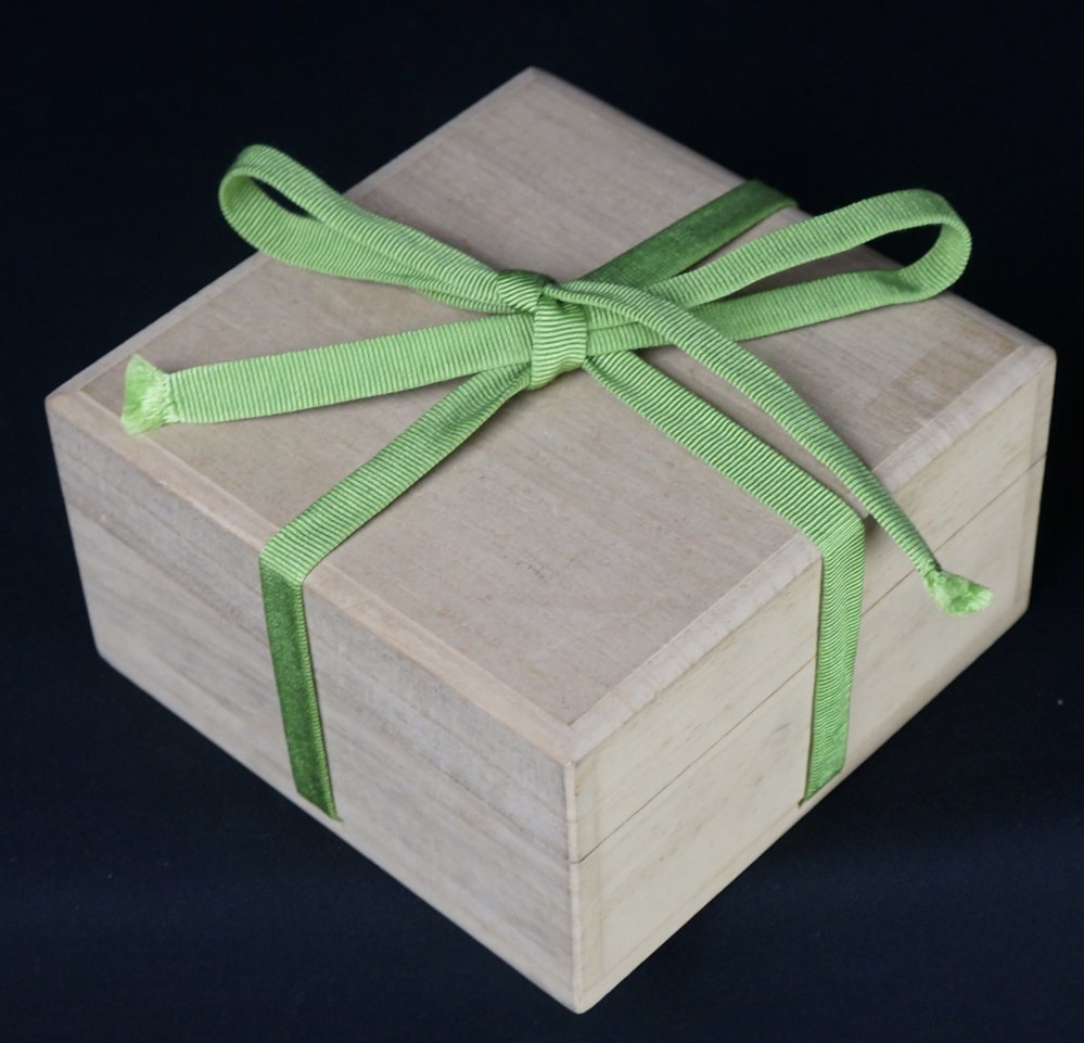 Nice Chawan tea bowl with Kintsuki restoration on rim. Nice shape and abstract green motif. Oribe kiln craft Kintsuki restoration on top rim. Makers seal visible on bottom, some wear from usage and time. Immediately usable with protective Kiri wood box.