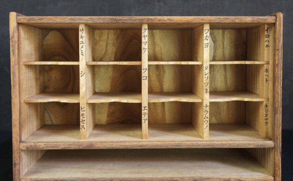 Vintage Japanese small cabinet wood furniture in good conditions, Kiridansu made of light Kiri wood, nice wood details, all parts working made of: main opening with 12 spaces and lower drwer. Some wear from usage and time, inner small box, hand craft cabinet. Minimalist and functional shape, immediately usable.