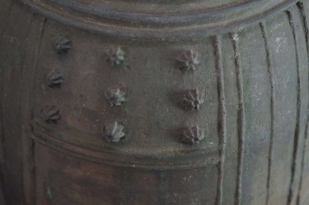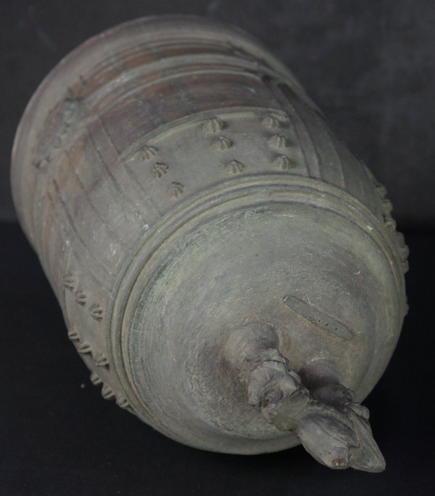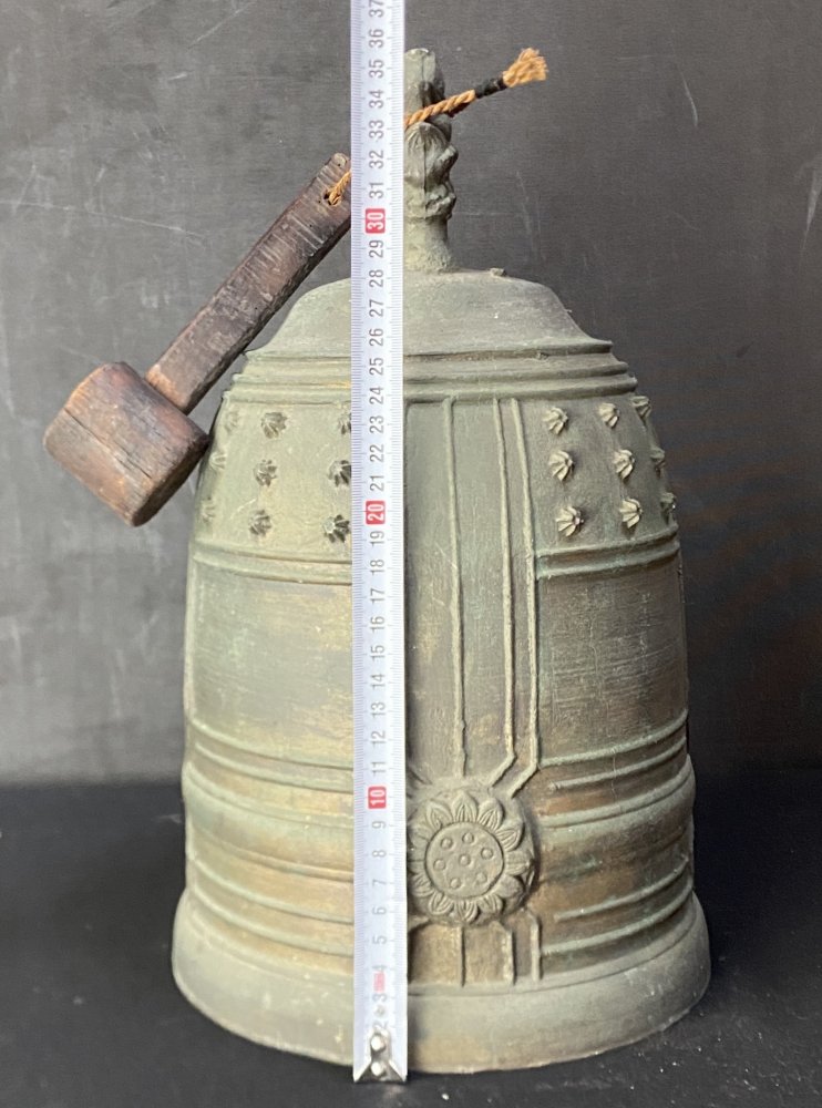 Antique Japanese bronze Temple bronze bell Ko-Bunshou, lost wax technique craft. Nice patina and design, bronze oxidation from exposure to elements, some ware from long usage and handling, no fracture good sound. Immediately usable with Bachi hitter, Buddhist Japan.