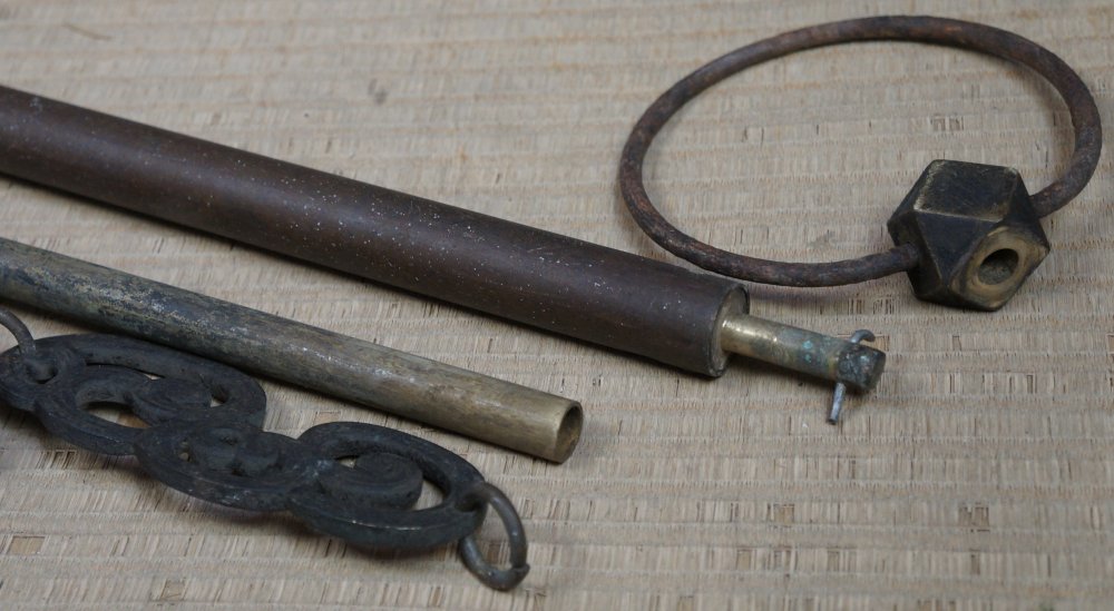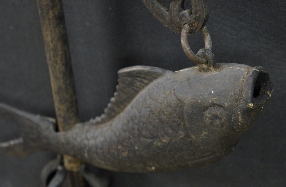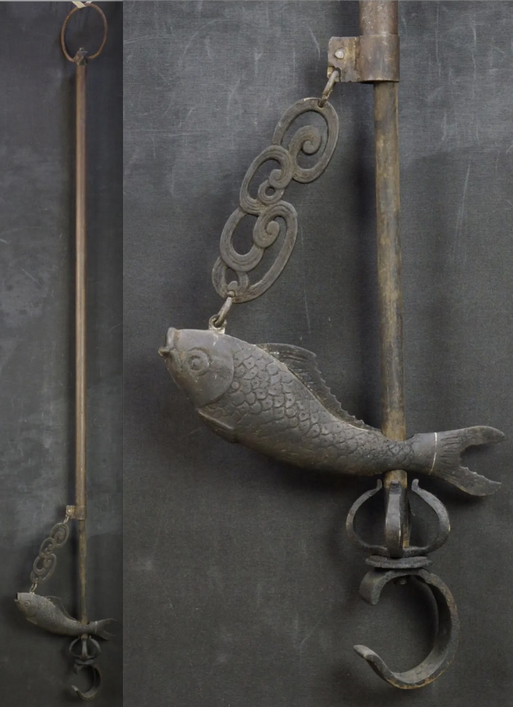 Antique Koi carp Jizai kettle holder rural Japan 1900 bronze craft