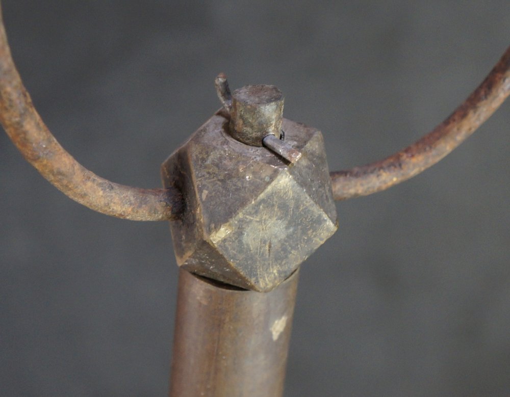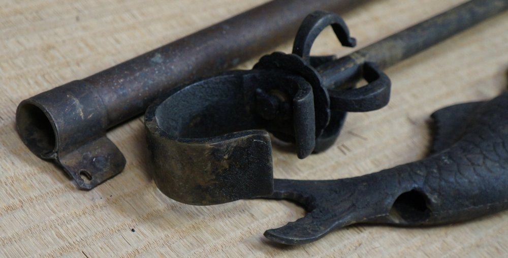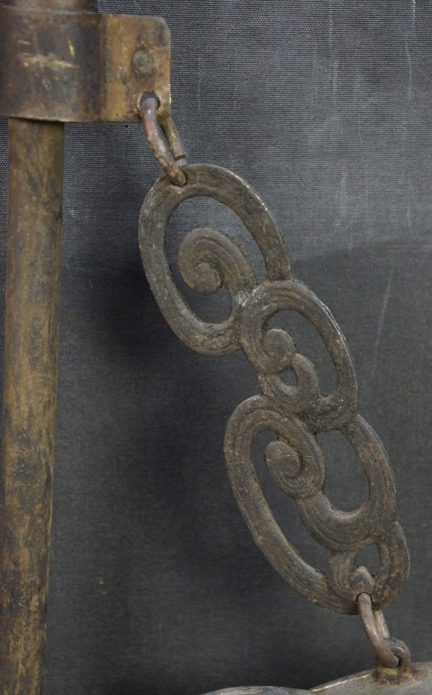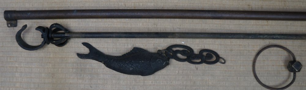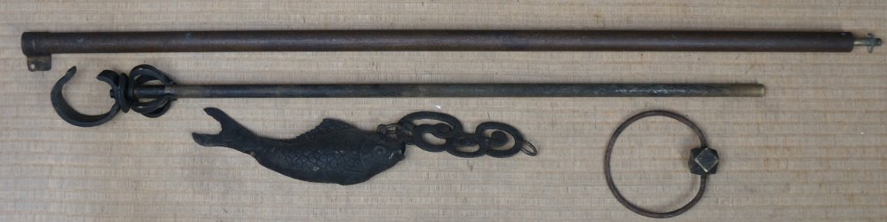 Antique rural Japanese Jizai kettle holder tea making tool, hand forged bronze, simple  and functional use, all parts working with nice patina, decorated with Koi carp. Some wear from long usage and sut sediments, immediately usable.